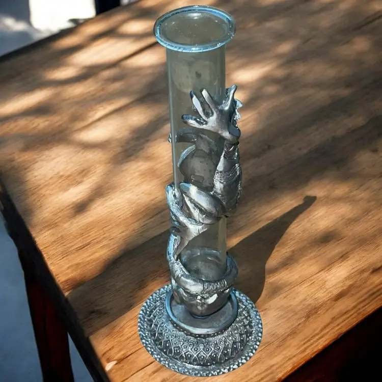 The clear glass vial measures approx. 5” long x 1” diameter and fits snugly into the metal base. The pewter itself stands about 5.25” tall and is slightly pliable, allowing you to adjust the grip if needed to perfectly straighten or reposition the glass.