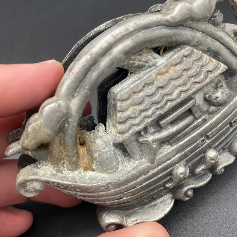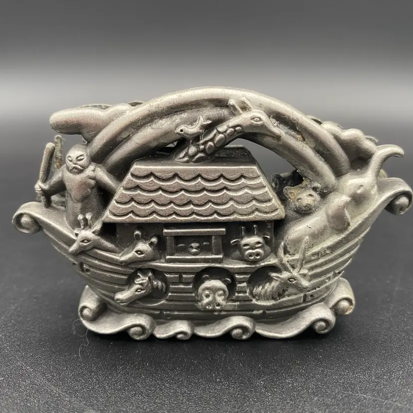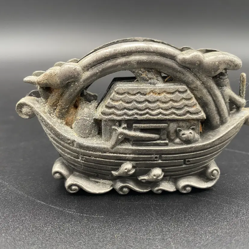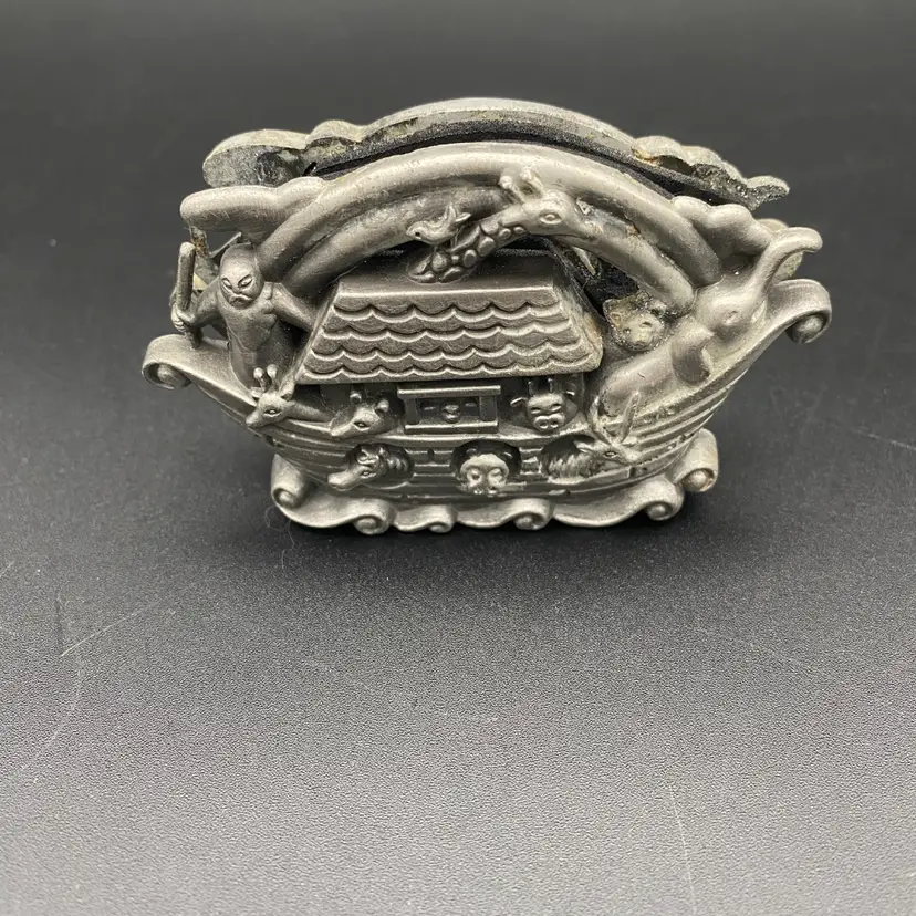 You are purchasing one vintage Pewter Noah's Arc Shaped Business Card or Letter Holder. This Holder is around 3.75 inches wide and up to 2.25 inches tall. These Piece is in decent condition in terms of no breaks or missing elements, just see final image for pewter wear affected on one side.