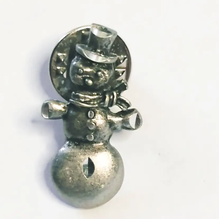 Vintage Pewter Snowman Lapel Pin. Condition is preowned. This charming vintage snowman lapel pin, crafted from pewter, adds a nostalgic touch to any outfit. Ideal for holiday or winter-themed attire. (FC03)