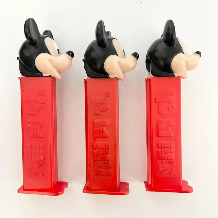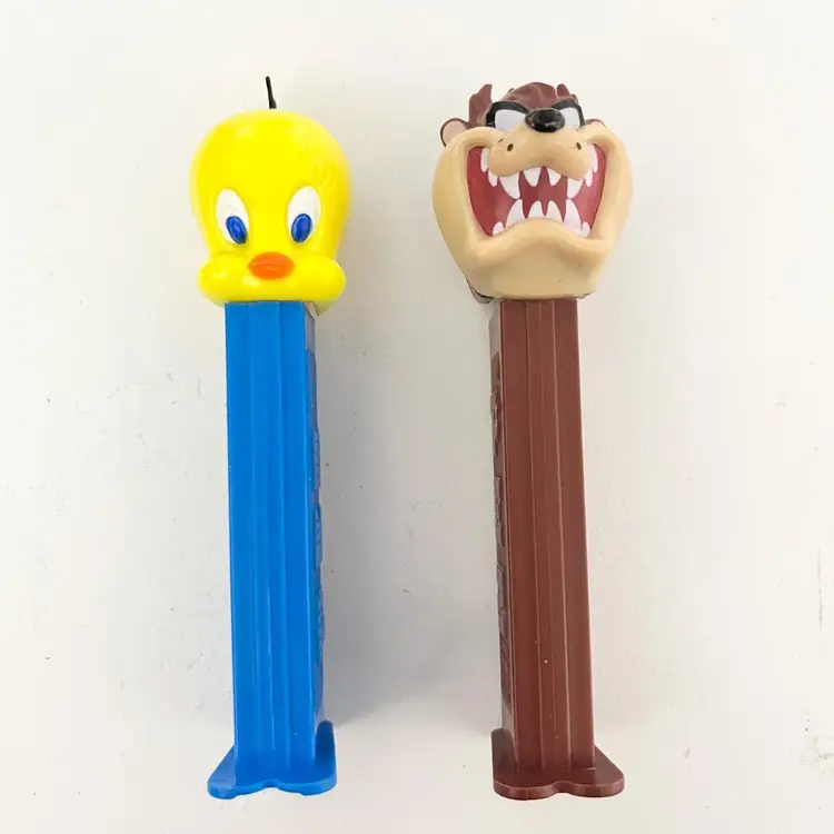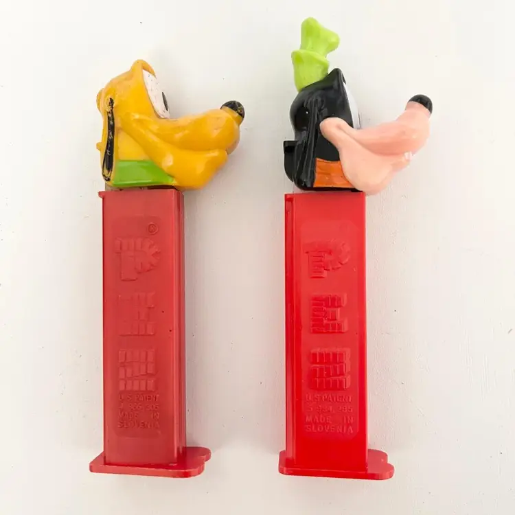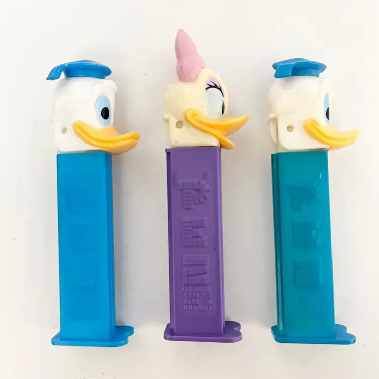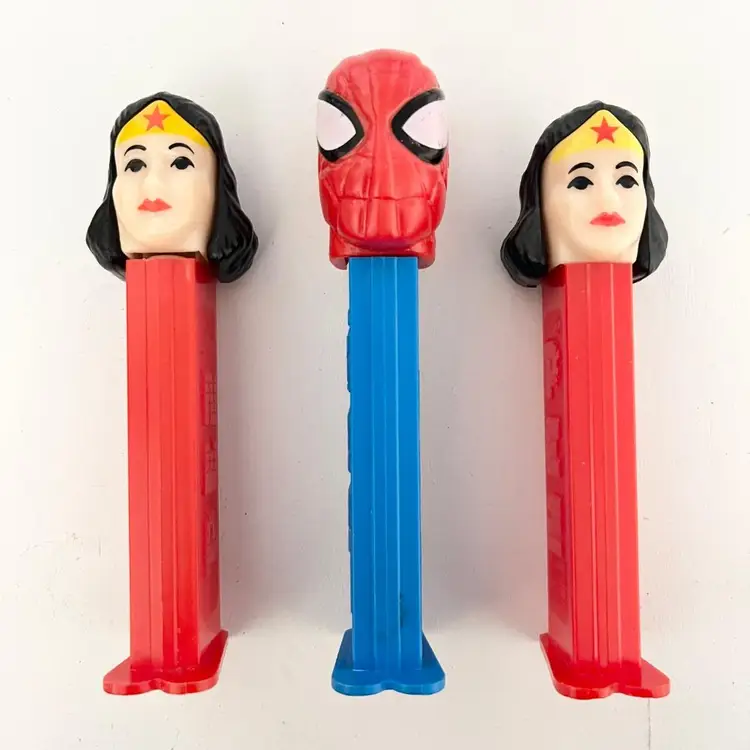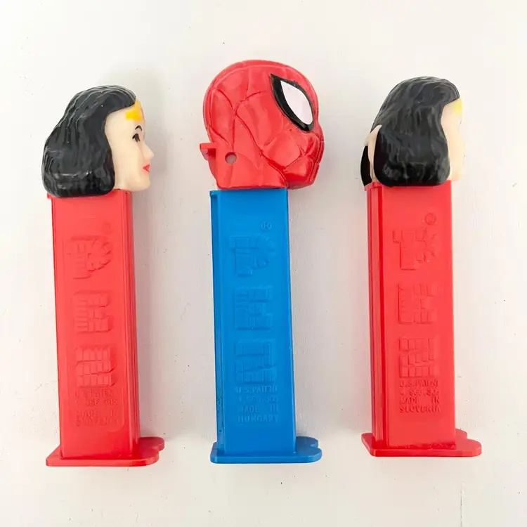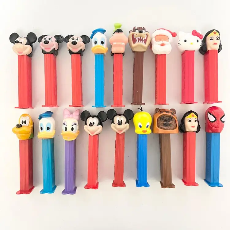 Vintage Pez Candy Dispensers Disney Looney Toons DC Comics Marvel Characters Lot of 18 Most are Retired From the 1980s 1990s The Hello Kitty is 2005 Tweety Bird Unknown Year Santa Claus Older Unknown Year 3 Mickey Mouse With Turned Up Nose Made in Slovenia 4.9 (Red) 2 Mickey Mouse With Straight Nose Made in Hungary 4.9 (Red) 2 Donald Duck Made in Hungary 4.9 (Blue) 1 Daisy Duck Made in Hungary 4.9 (Purple) 1 Goofy Made in Slovenia 5.9 (Red) 1 Pluto Made in Slovenia 4.9 (Red) 1 Tweety Bird Made in China 4.9 (Blue) 1 Tasmanian Devil Made in Hungary 4.9 (Brown) 2 Wonder Woman Made in Slovenia 4.9 (Red) 1 Spider Man Made in Hungary 4.9 (Blue) 1 Santa Claus Made in Yugoslavia 3.9 (Red) 1 Hello Kitty Made in Hungary 7.5 (Red) 1 Star Wars Chewbacca Made in Slovenia 4.9 (Brown) Condition: A little dusty. Could use a good cleaning. All heads snap back easily. The Daisy Duck head seems a little looser as far as snap back. All have been handled and have wear. Measures 4 to 4-1/2 inches Packaged in a rigid box Visit my store to see more vintage ephemera, advertising, novelties, gifts, estate sale and yard sale finds https://district.net/u/finderspickerspaper SKU B1 Bin