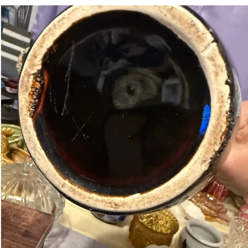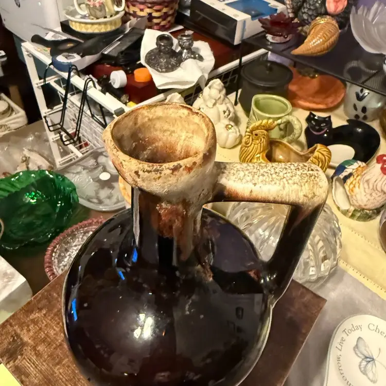 This stoneware piece is known for its distinctive brown drip glaze design and closed ice lip. It's a collectible item from the Mid-Century Modern period, specifically the Pfaltzgraff Gourmet Brown product line.