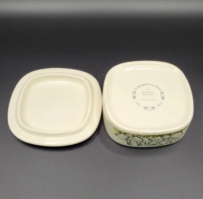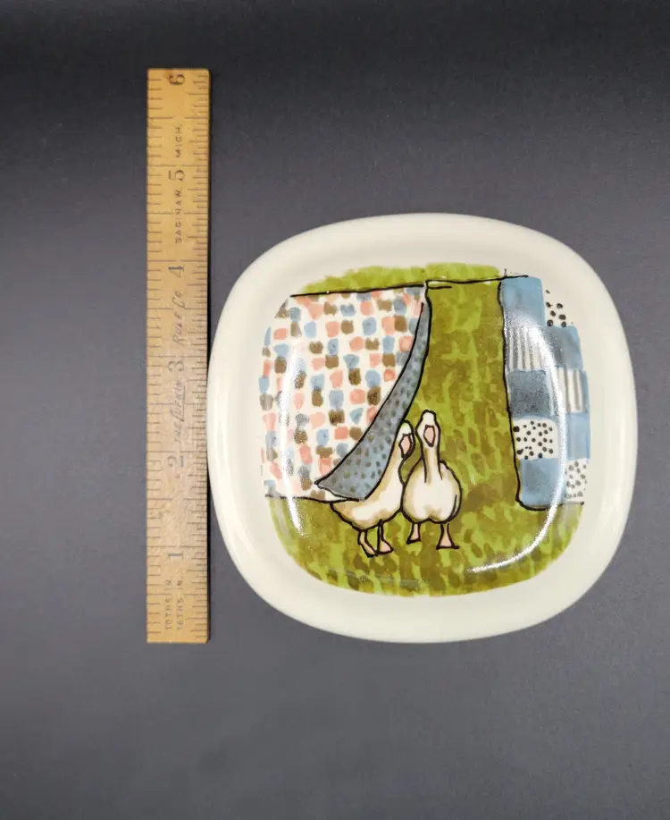 This porcelain trinket dish is in excellent condition with no cracks, chips. Featuring geese and a clothesline of quilts on the lid and geese lining the sides of the dish.