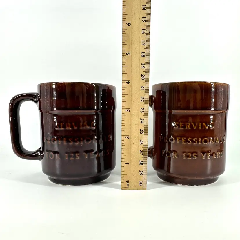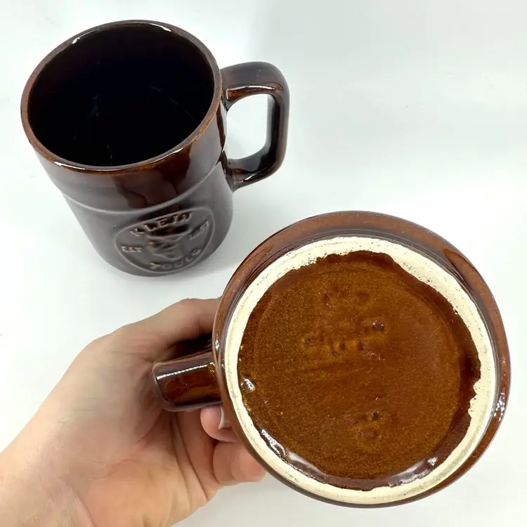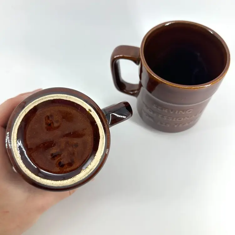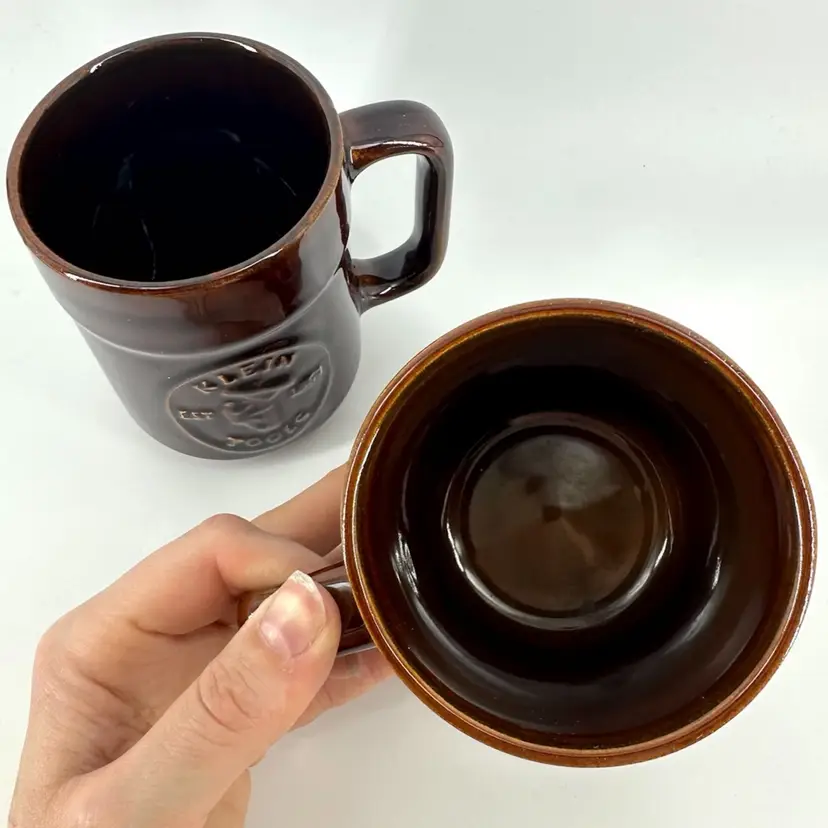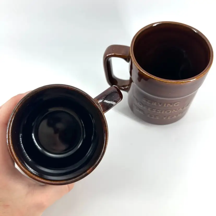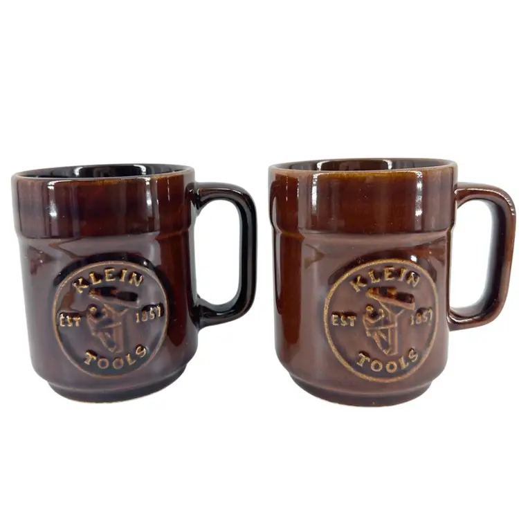 Set of two vintage collectible brown glossy glaze mugs promoting Klein Tools Lineman EST. 1857 with the text “SERVING PROFESSIONALS FOR 125 YEARS” on the other side. Made by Pfaltzgraff. Each mug measures approximately 4” tall. Has an illegible imprinted signature on the bottom. No chips or cracks on either.