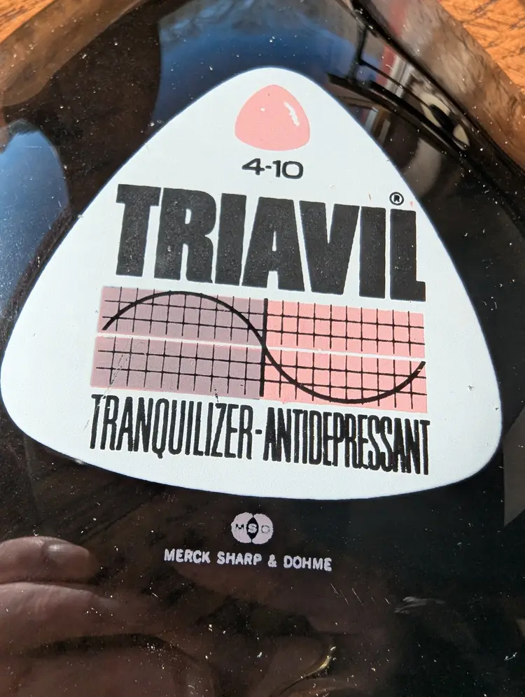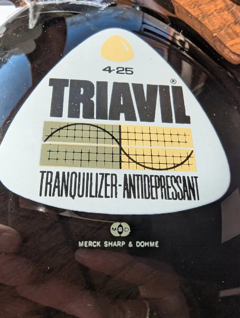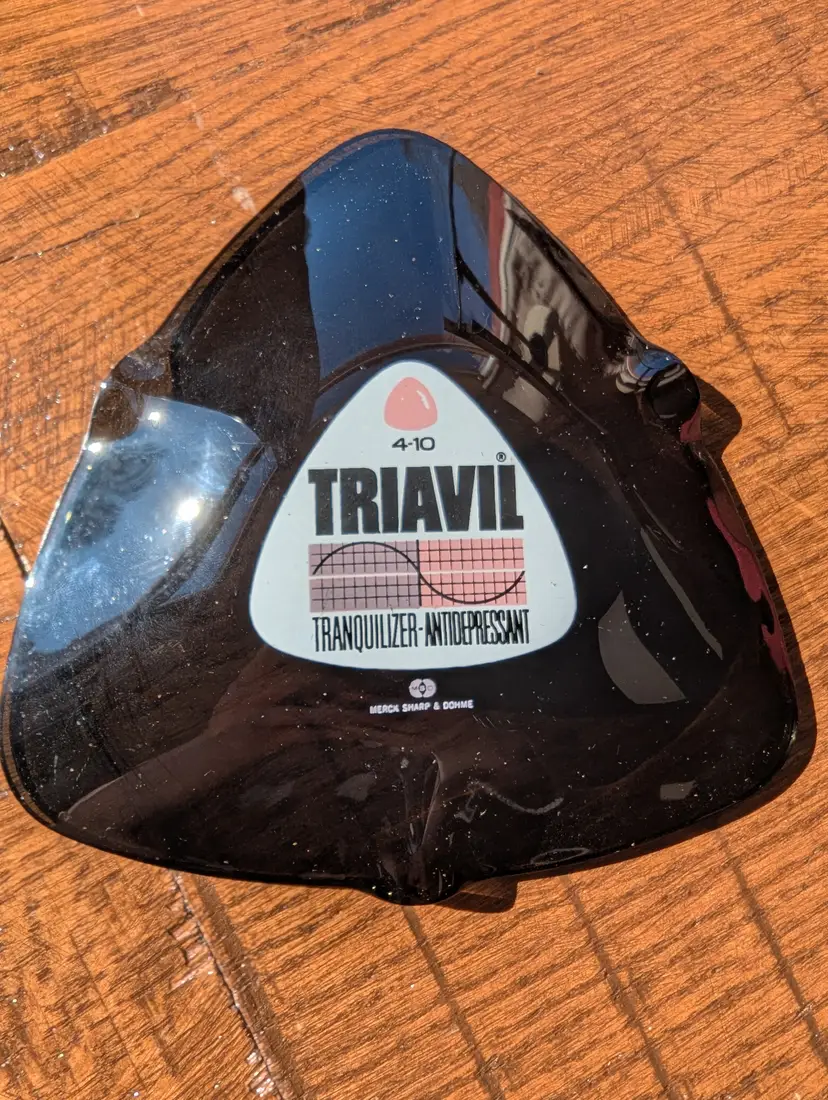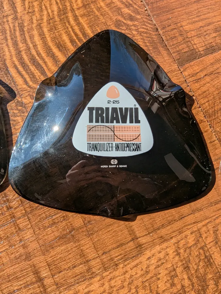 Vintage Pharmaceutical Advertising - Triavil tranquilizer/antidepressant ash trays set of 3. Merck pharmaceutical advertising piece. No visible use or wear. Smoked glass with screen printed advertising. Will only sell as a set.