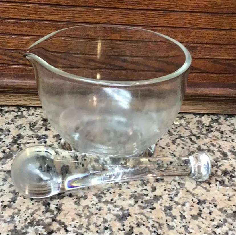 Vintage Pharmacy clear glass Mortar & Pestle Set 32 oz This is an antique, part of my father's pharmacy collection (he has been a pharmacist since the 50's) lab laboratory Great gift for a pharmacist or med student Great for anyone that cooks or a chef too! no cracks or chips, although how it was made there is a little glass nub, see the last photo, no biggie. 1