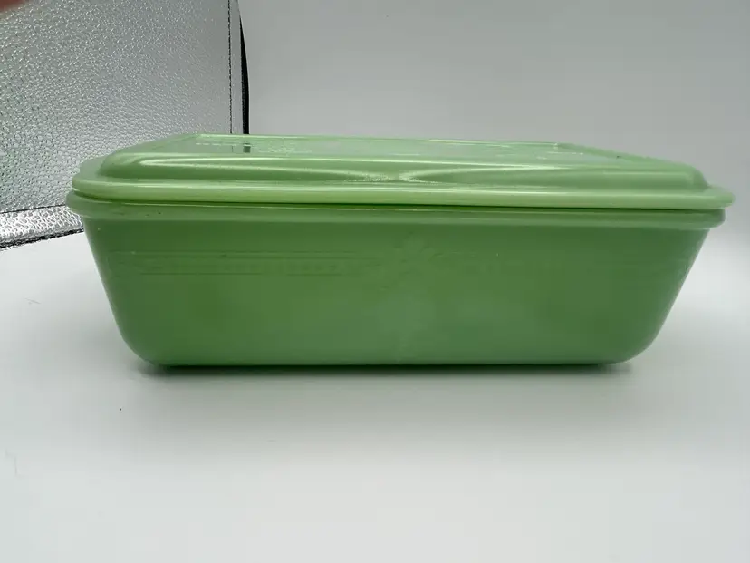 This vintage Fire King jadeite refrigerator glass dish with lid is a classic piece of mid-century kitchen decor. The rectangular shape and glossy green finish add a touch of retro charm to any dining or kitchen space. Made of durable glass, this covered dish is not only functional but also stylish, with a vintage appeal that harks back to the 1940s. The Fire-King product line ensures quality and craftsmanship, making this piece a desirable addition to any collection of pottery and glassware.