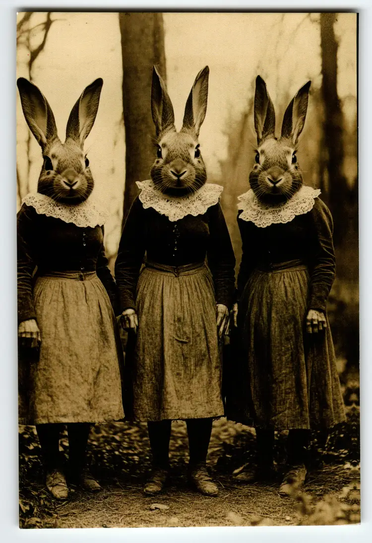 This unique vintage photochrome postcard features a surreal and whimsical image of three women standing side by side, each with a rabbit head replacing their human faces. The sepia-toned photograph captures the women dressed in period-style dresses with lace collars, standing outdoors among trees. The artistic fusion of human and animal elements creates an intriguing and collectible piece of photo art postcard history. Measuring approximately 5.5" x 4", this postcard is made of paper and retains the classic photochrome printing style popular from 1939 to the present.