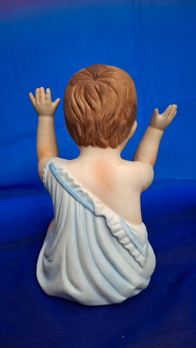 Vintage Piano Baby Boy Figurine | Bisque Porcelain Child Statue | Mid Century Decor Classic vintage piano baby boy figurine seated with raised hands. Made of unmarked bisque porcelain with soft pastel coloring and molded curls. Vent holes in the base are consistent with mid-century Japanese production. A timeless nursery, piano top, or shelf display piece. Details: • Height: approx. 7.5 inches • Width: approx. 5.5 inches • Material: Bisque porcelain • Era: 1955–1975 Very good vintage condition with light age wear. No cracks or repairs noted.