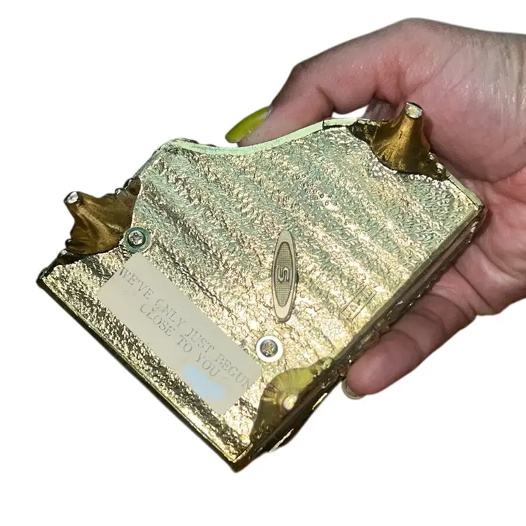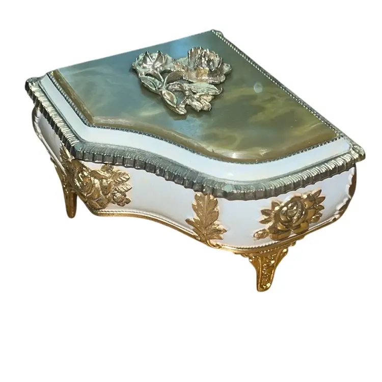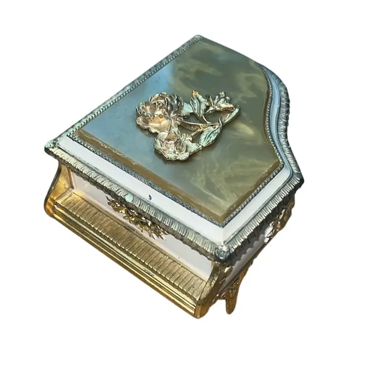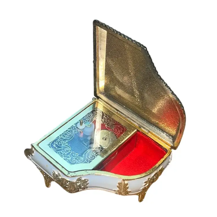 It plays we’ve only just begun close to you. It works perfectly. Marked Japan on the bottom. it’s metal and I believe lucite or acrylic on the top 2 1/2 inches tall 3 1/2 x 3 1/2“