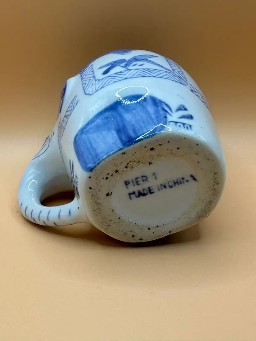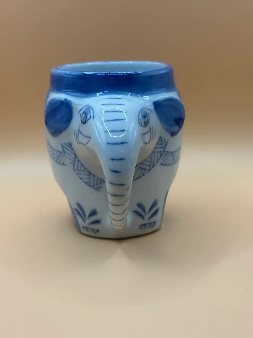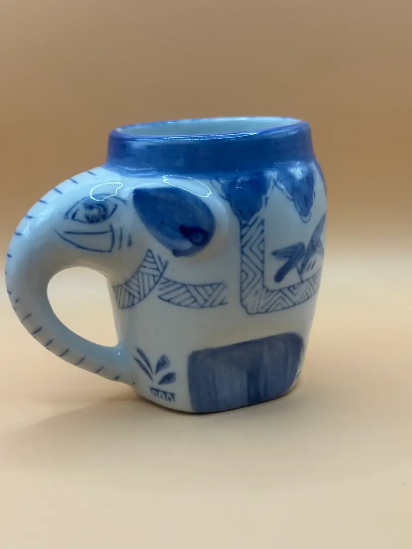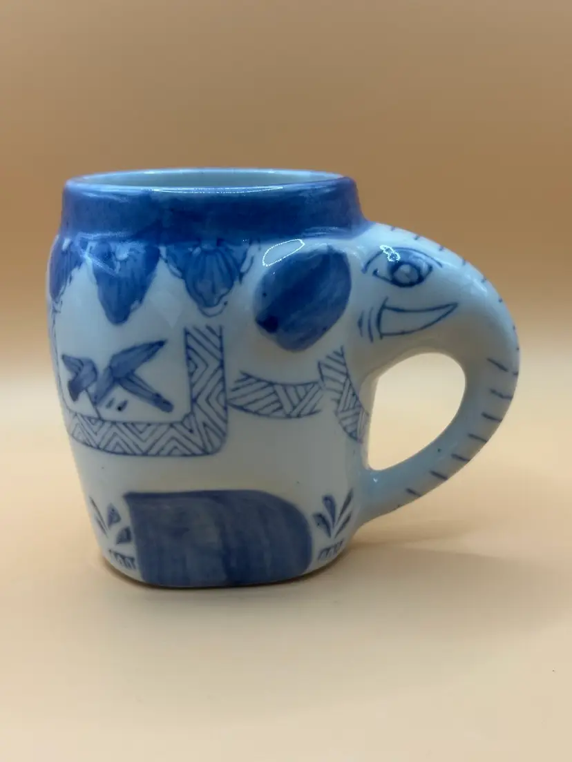 This vintage Pier 1 Imports Good Luck Elephant Porcelain Mug features a charming design with a blue and white elephant pattern and a unique trunk handle. Made of porcelain, this coffee mug has a capacity of 8 ounces and can be used for hot or cold beverages. This mug is an original piece from Pier 1 Imports, perfect for all occasions and adding a touch of whimsy to your drinkware collection. No chips or cracks measures 3.5 inches tall 4.5 inch width with handle.
