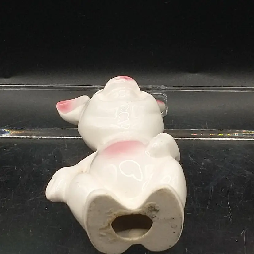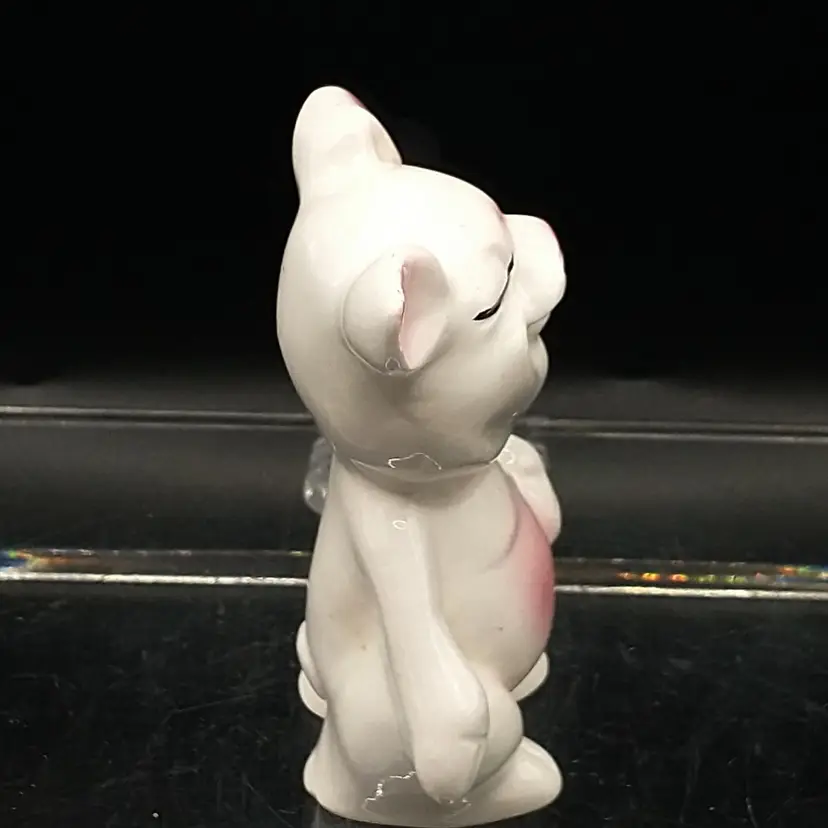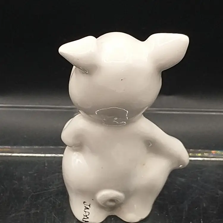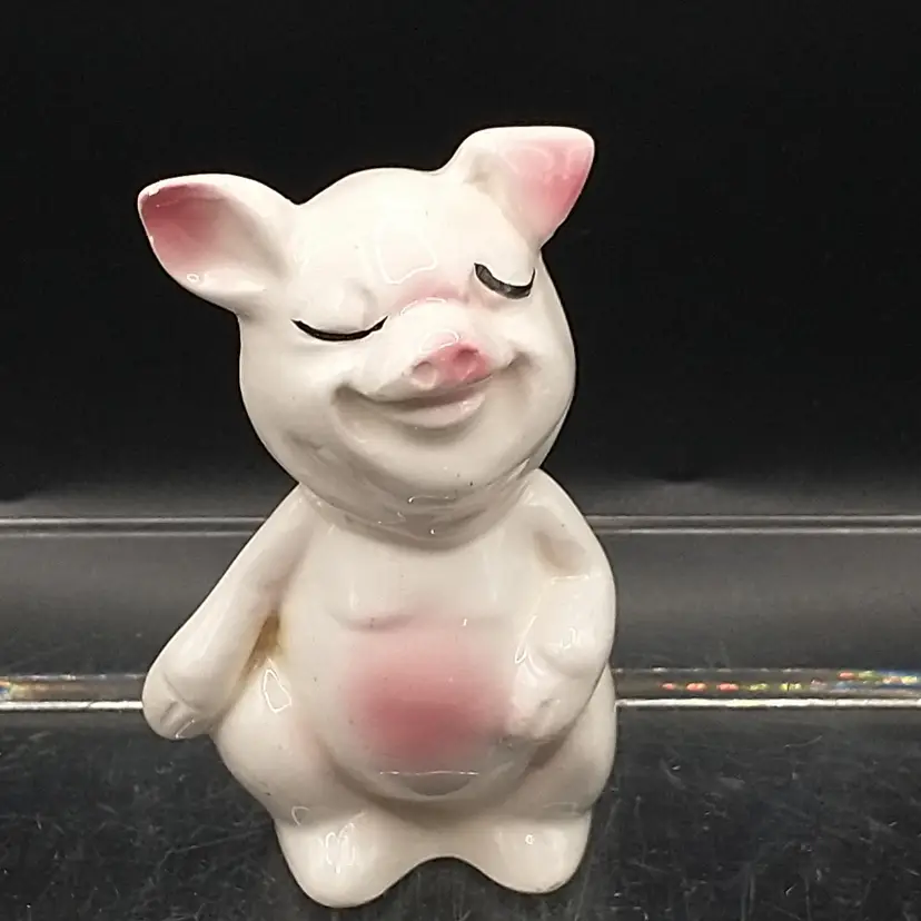 This vintage anthropomorphic pig figurine is made in Japan. The pig is white and features pink ears, nose, and stomach. The pig is smiling and his eyes are closed. The figurine stands 3 1/2" tall and is 2" in diameter. There are no chips or cracks. I have taken photos from all angles but if you need additional ones, please let me know.