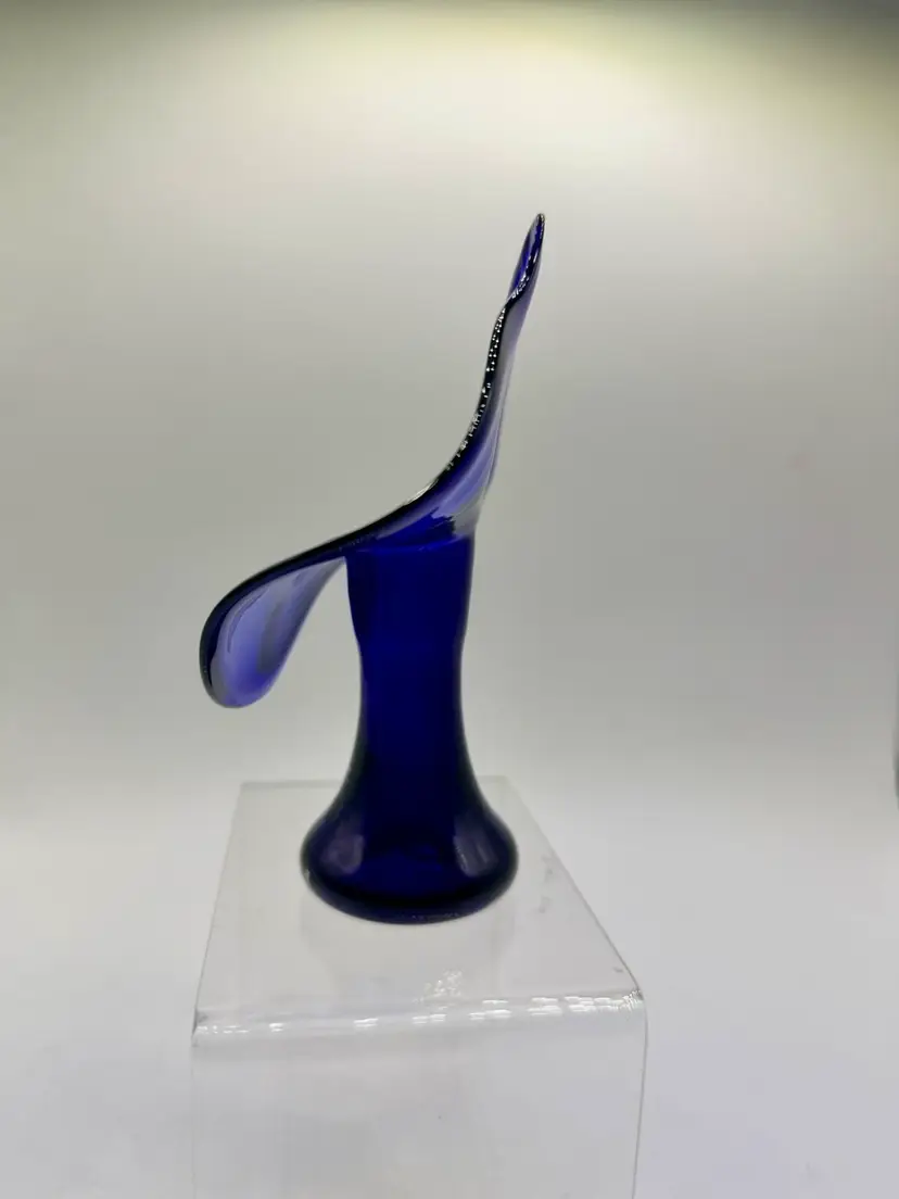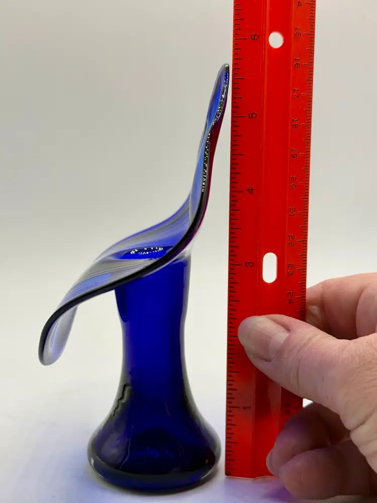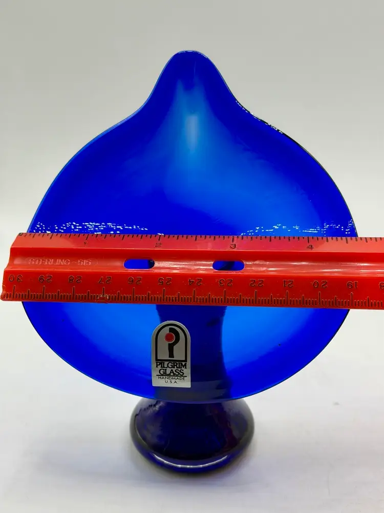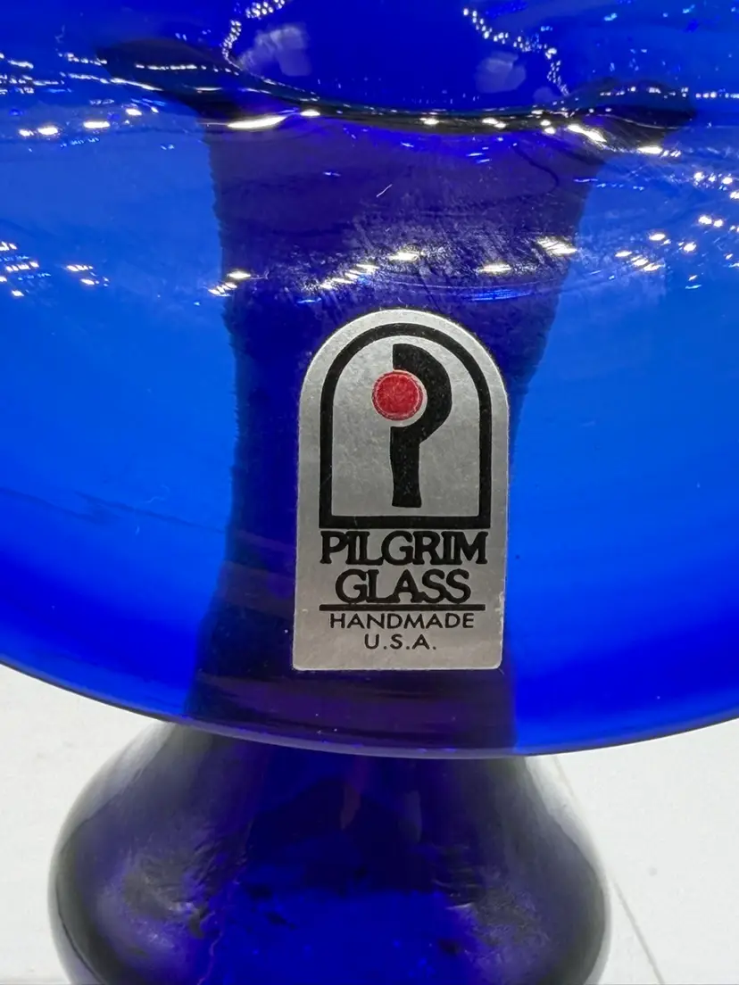 The Vintage Pilgrim Art Glass cobalt blue Jack in Pulpit Vase Candle Holder is a stunning piece of American-made glass art. Standing at 5.75 inches tall, this hand-blown glass vase features a unique Jack in the Pulpit design, signed with a sticker by the Pilgrim brand. The rich cobalt color and artistic theme make it a beautiful addition to any decor, showcasing the craftsmanship and artistry of vintage glass production techniques.