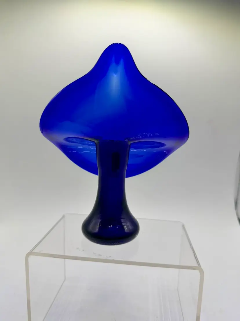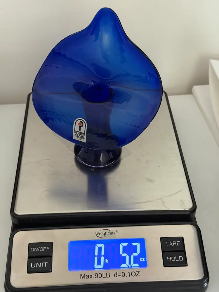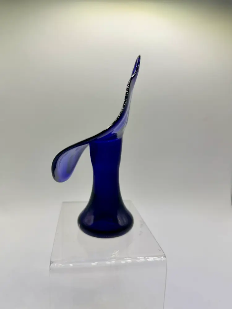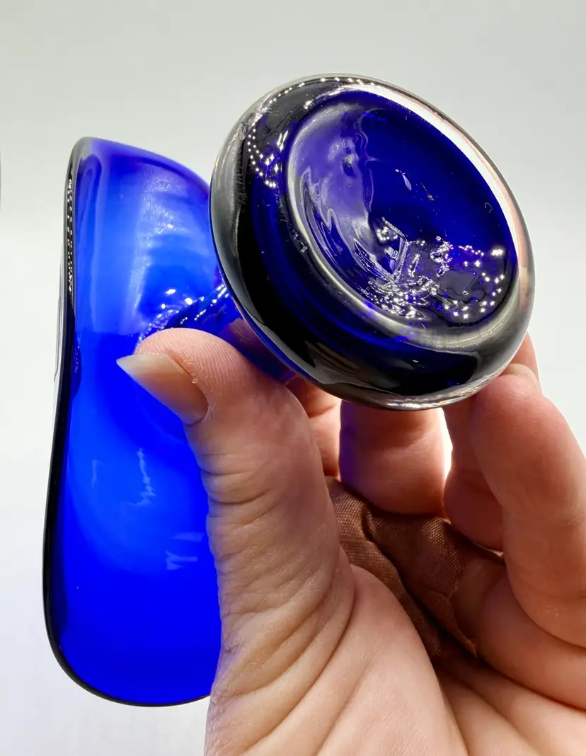 The Vintage Pilgrim Art Glass cobalt blue Jack in Pulpit Vase Candle Holder is a stunning piece of American-made glass art. Standing at 5.75 inches tall, this hand-blown glass vase features a unique Jack in the Pulpit design, signed with a sticker by the Pilgrim brand. The rich cobalt color and artistic theme make it a beautiful addition to any decor, showcasing the craftsmanship and artistry of vintage glass production techniques.