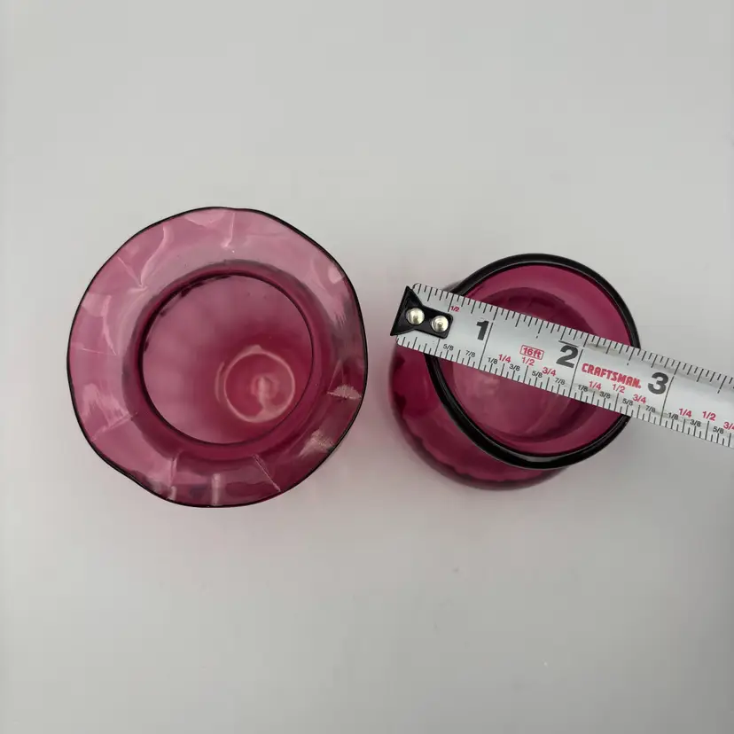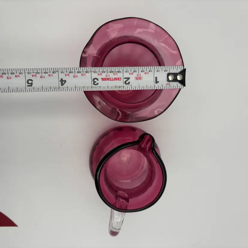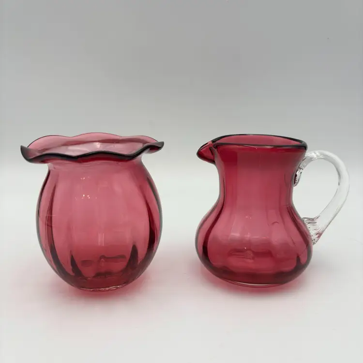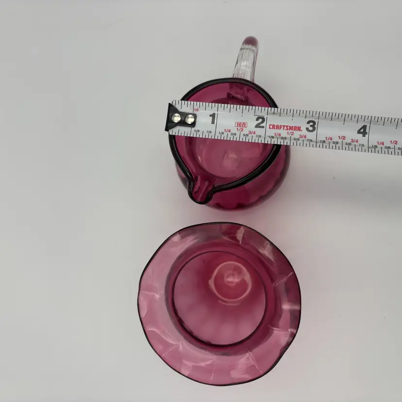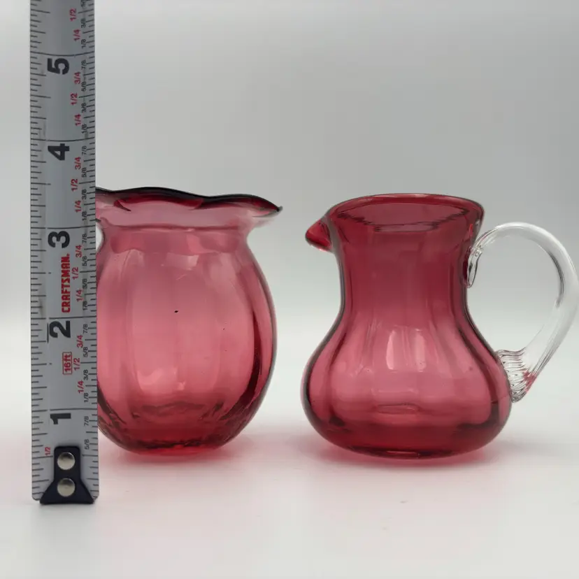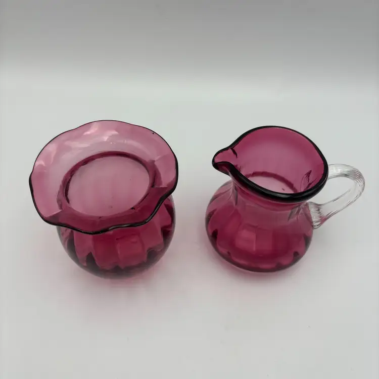 For sale is a Vintage Pilgrim Cranberry Glass Handblown Open Sugar and Creamer with Applied Handle Set