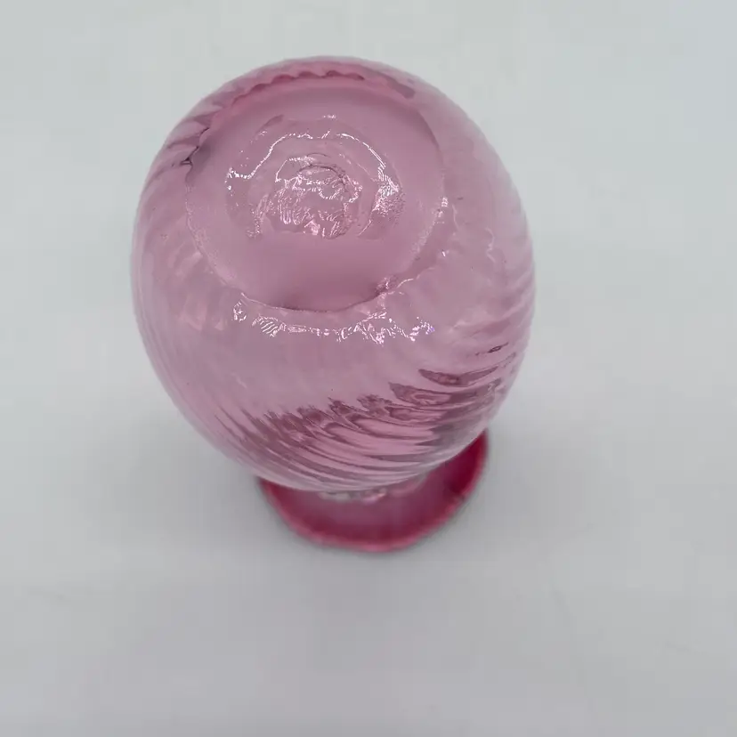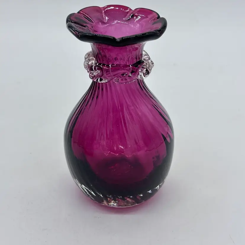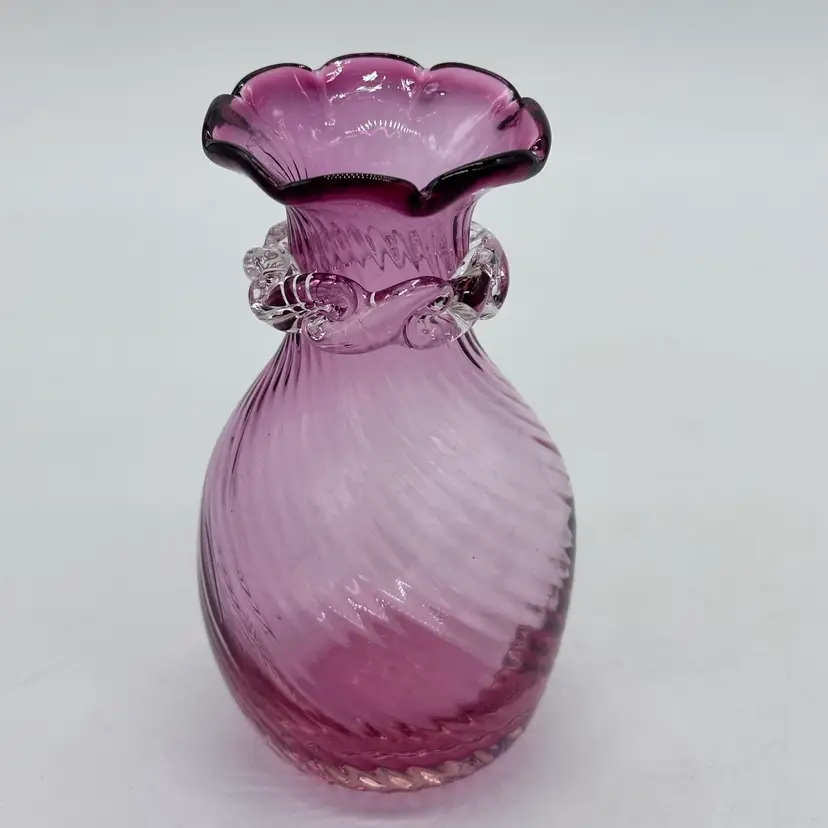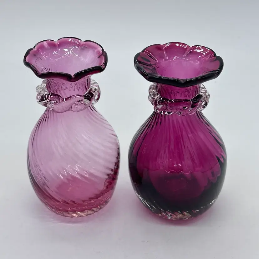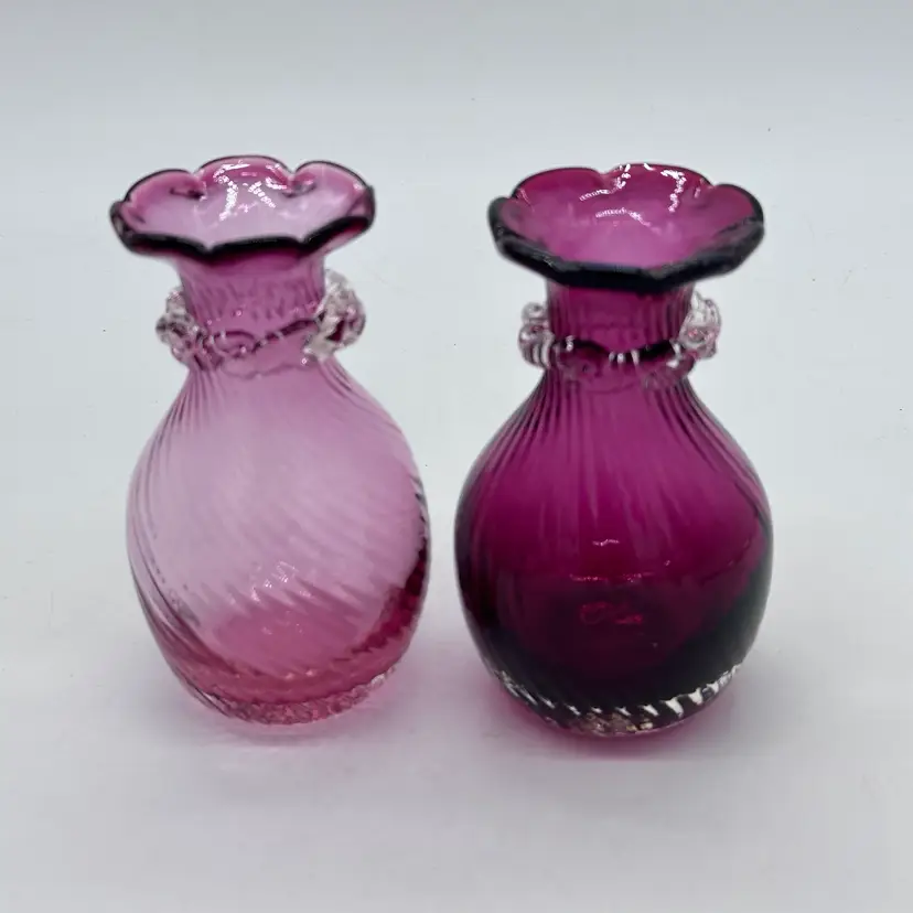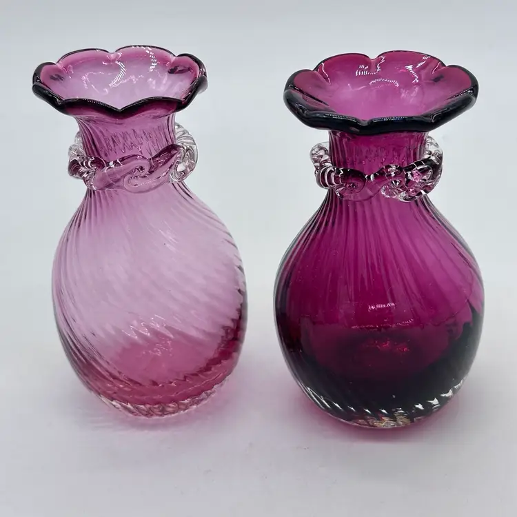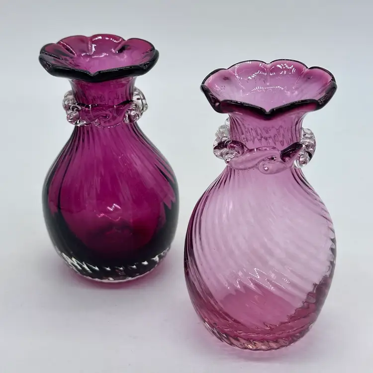 Vintage Hand Blown Pilgrim Glass Cranberry & Pink Bud Vases Ruffle Swirl Optic Rigaree. Condition is used but in good condition. Does not have any chips or cracks but the light pink vase has minor scuffing on the underside of collar. The cranberry vase measures approximately 4 1/2 inches tall and 2 3/4 inches wide. The light pink vase measures approximately 4 1/2 inches tall and 2 1/2 inches wide