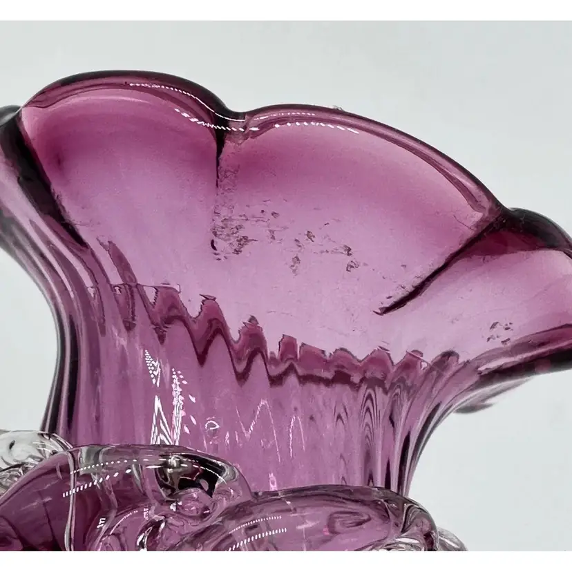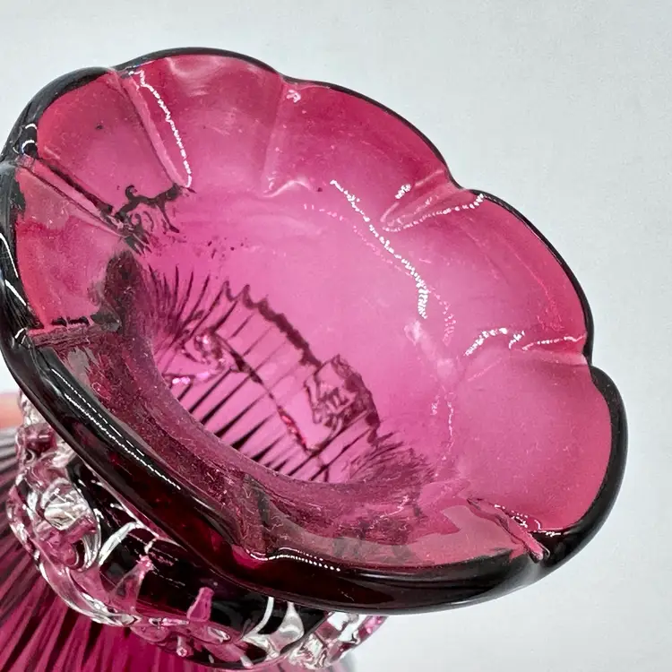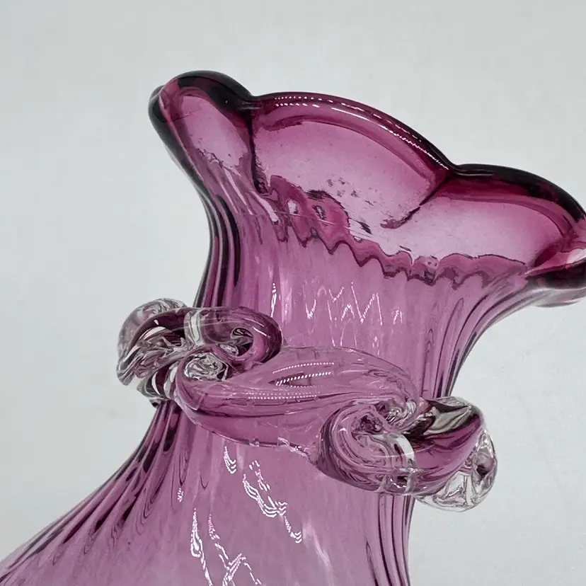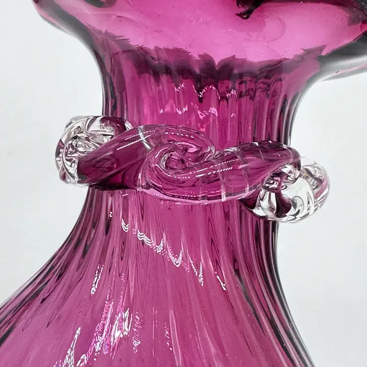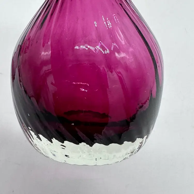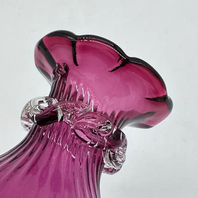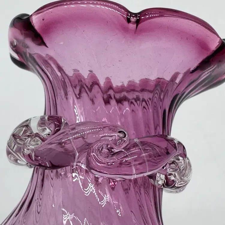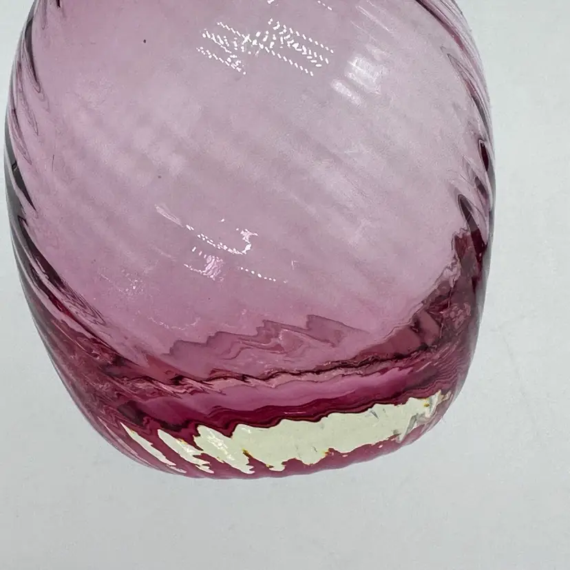 Vintage Hand Blown Pilgrim Glass Cranberry & Pink Bud Vases Ruffle Swirl Optic Rigaree. Condition is used but in good condition. Does not have any chips or cracks but the light pink vase has minor scuffing on the underside of collar. The cranberry vase measures approximately 4 1/2 inches tall and 2 3/4 inches wide. The light pink vase measures approximately 4 1/2 inches tall and 2 1/2 inches wide