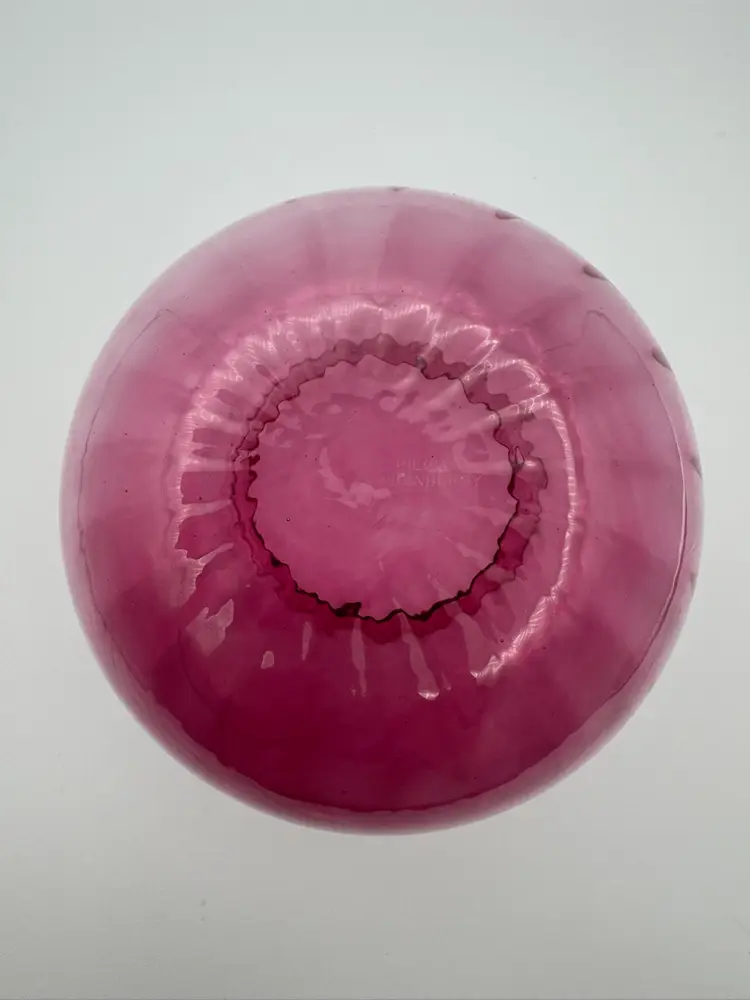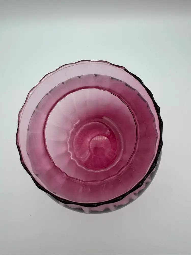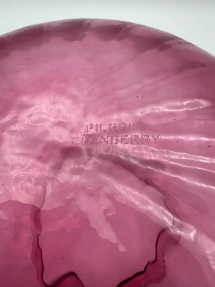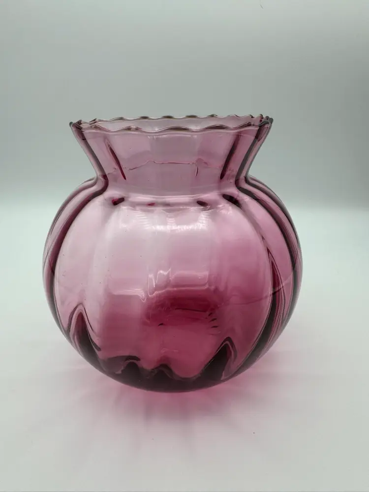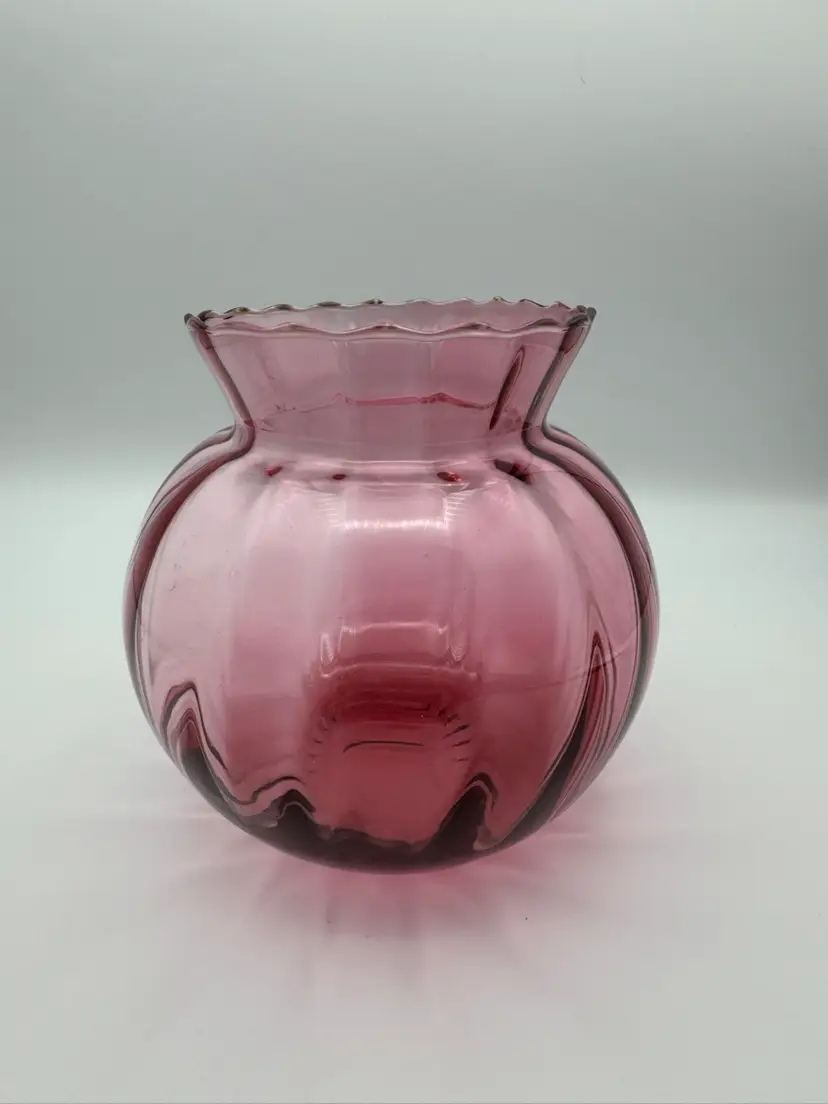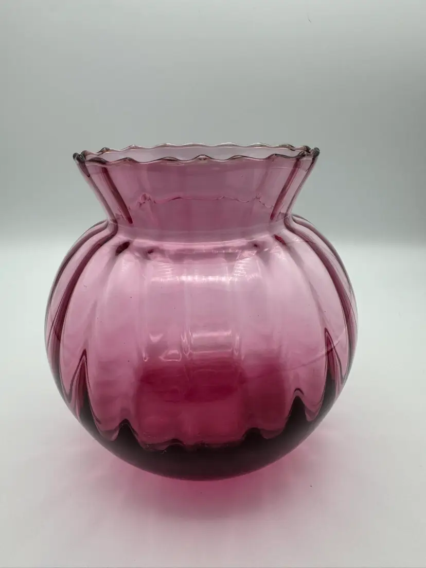 This beautiful vintage Pilgrim Glass cranberry glass rose bowl is a beautifully crafted vase made of hand-blown glass. The vase features a rich cranberry hue, showcasing the elegant and traditional cranberry glass production style. With the Pilgrim brand known for its quality glassware, this vase is a charming and timeless piece that would make a lovely addition to any home decor collection. Excellent condition. No chips or cracks. Measures 5 1/4” X 6”