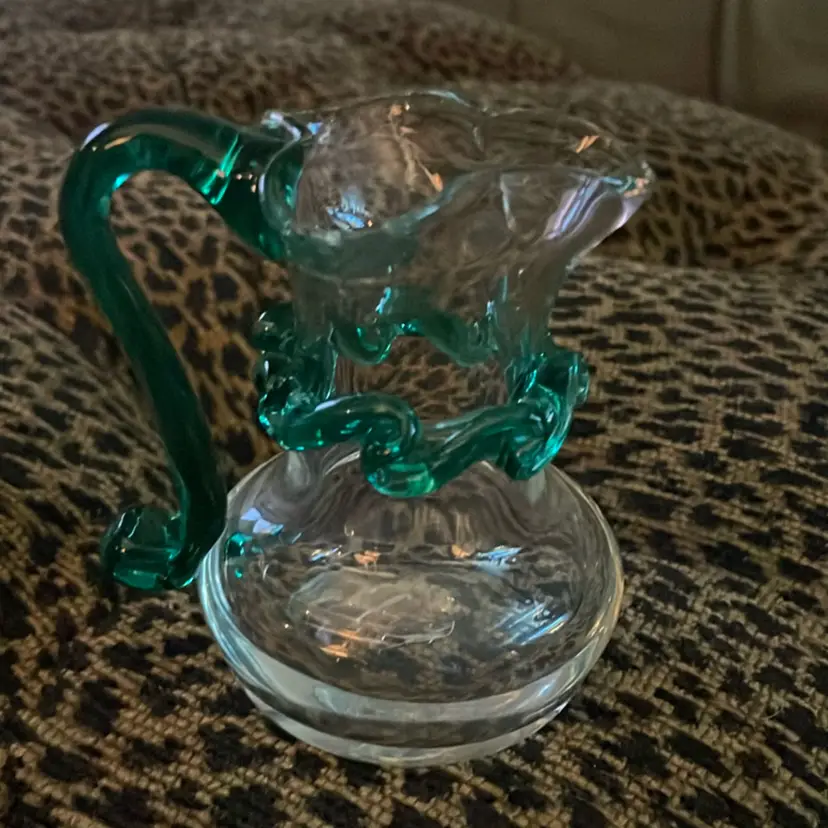 This is a vintage clear glass pitcher or vase with green applied glass trim and handle by Pilgrim Glass. It features a distinctive applied green glass ribbon around the neck and an attached handle. The clear body of the item is hand-blown glass. Most likely from the 1940s to 50s