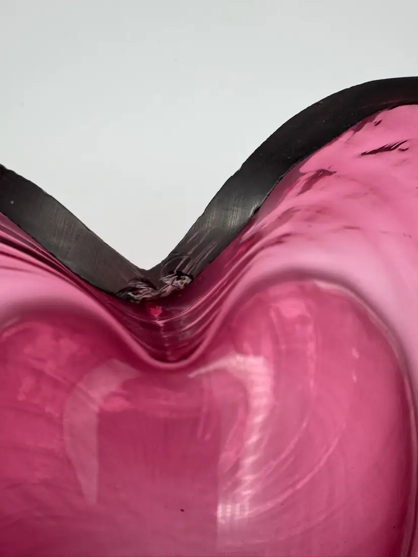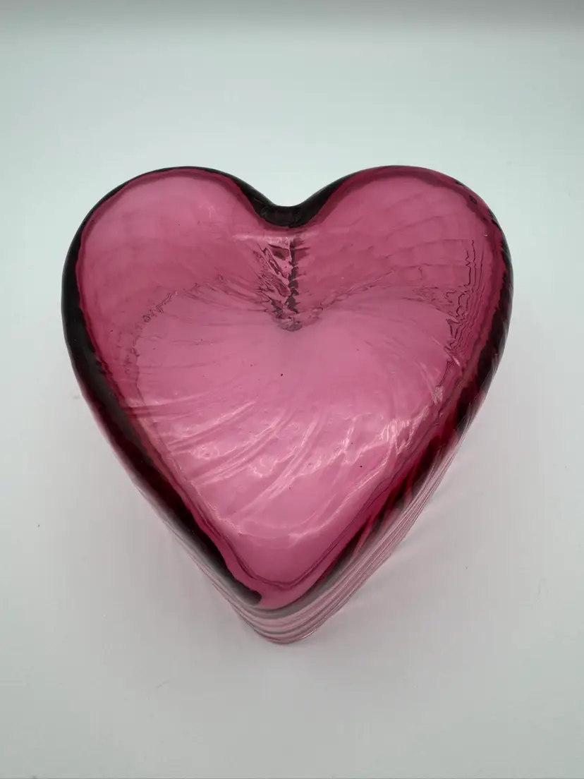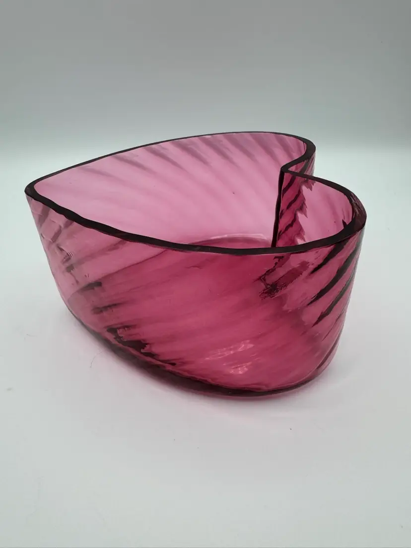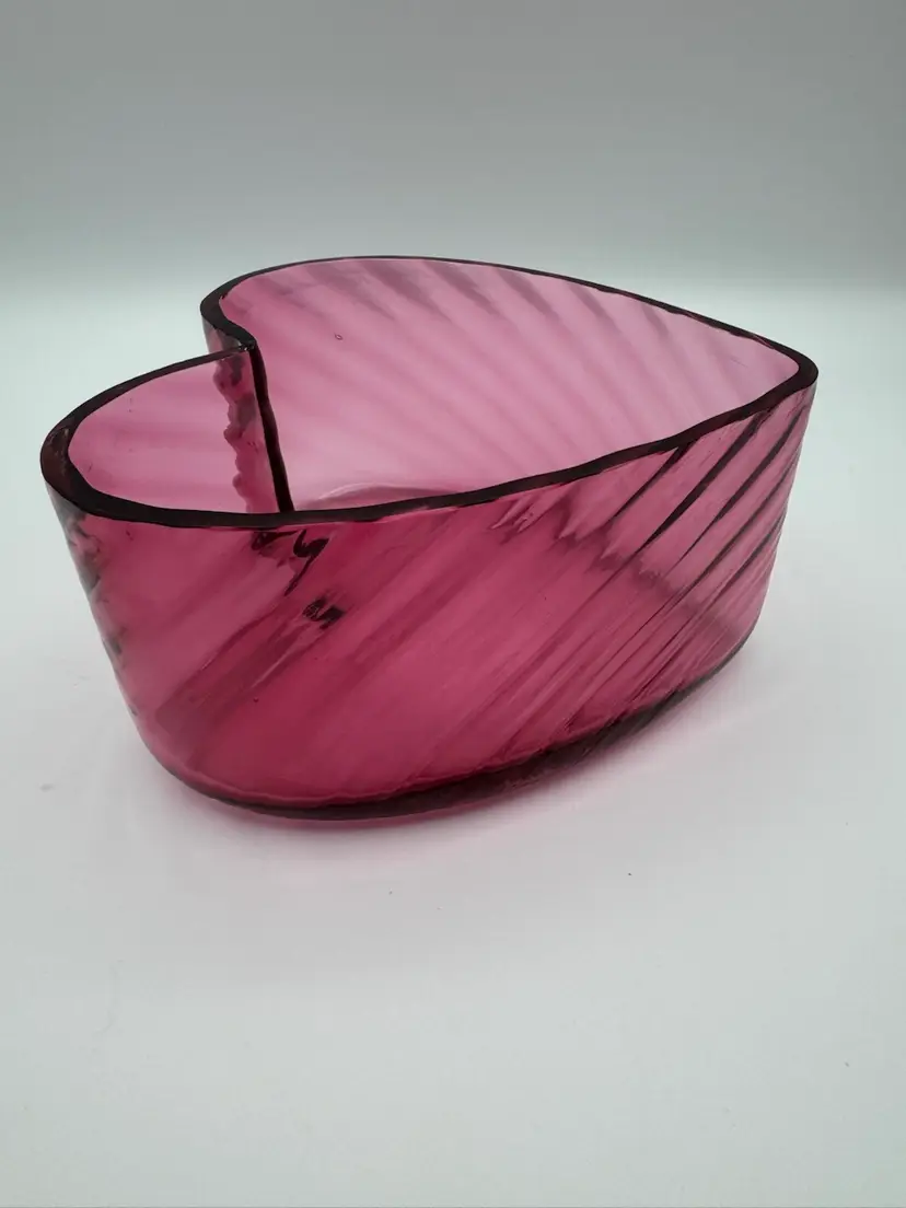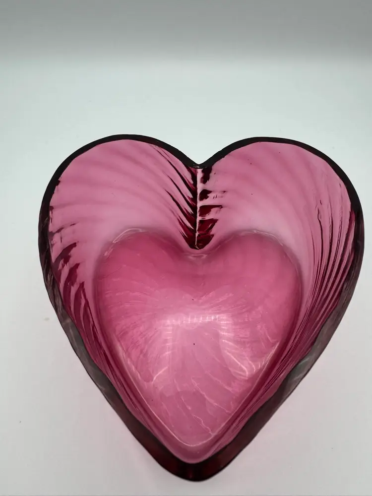 The Vintage Pilgrim Optic Glass Cranberry Heart Bowl is a charming decorative piece for any home. Made of hand-blown cranberry glass, this bowl features a unique heart shape and a vintage design that adds a touch of elegance to any space. The pink color and optic glass pattern make it a standout piece that can be used as a decorative object or as a functional bowl for serving special treats. Perfect for collectors of vintage glassware or those looking to add a pop of color to their home decor. Beautiful condition. No cracks. Has only a couple fleabites on top rim. Very unnoticeable and not sharp looks like they could have been from production bubbles. Please see photos. Measures 3" X 5 1/2"