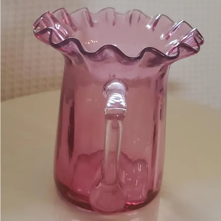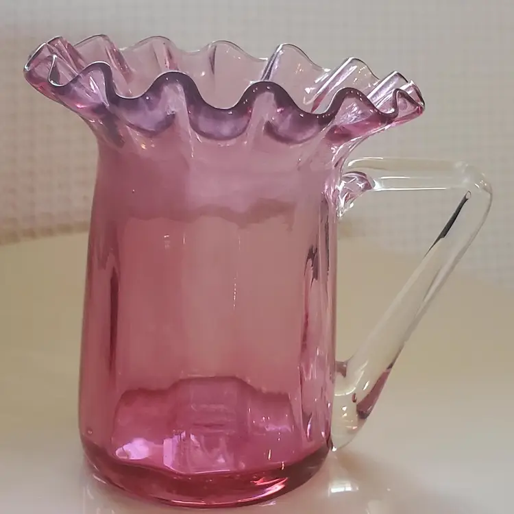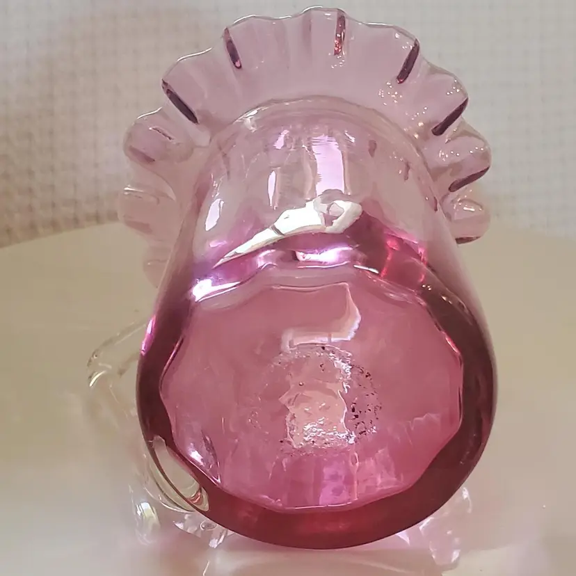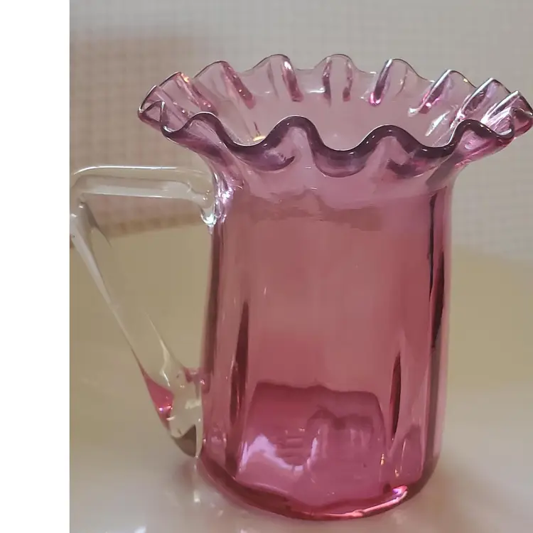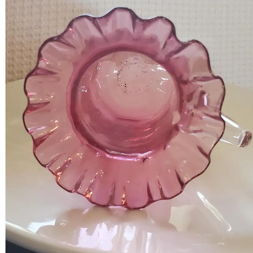 Blown glass and with a clear handle. 3 1/8" tall and 3 1/2" wide. Research says this a discontinued piece. So very pretty! In perfect condition.