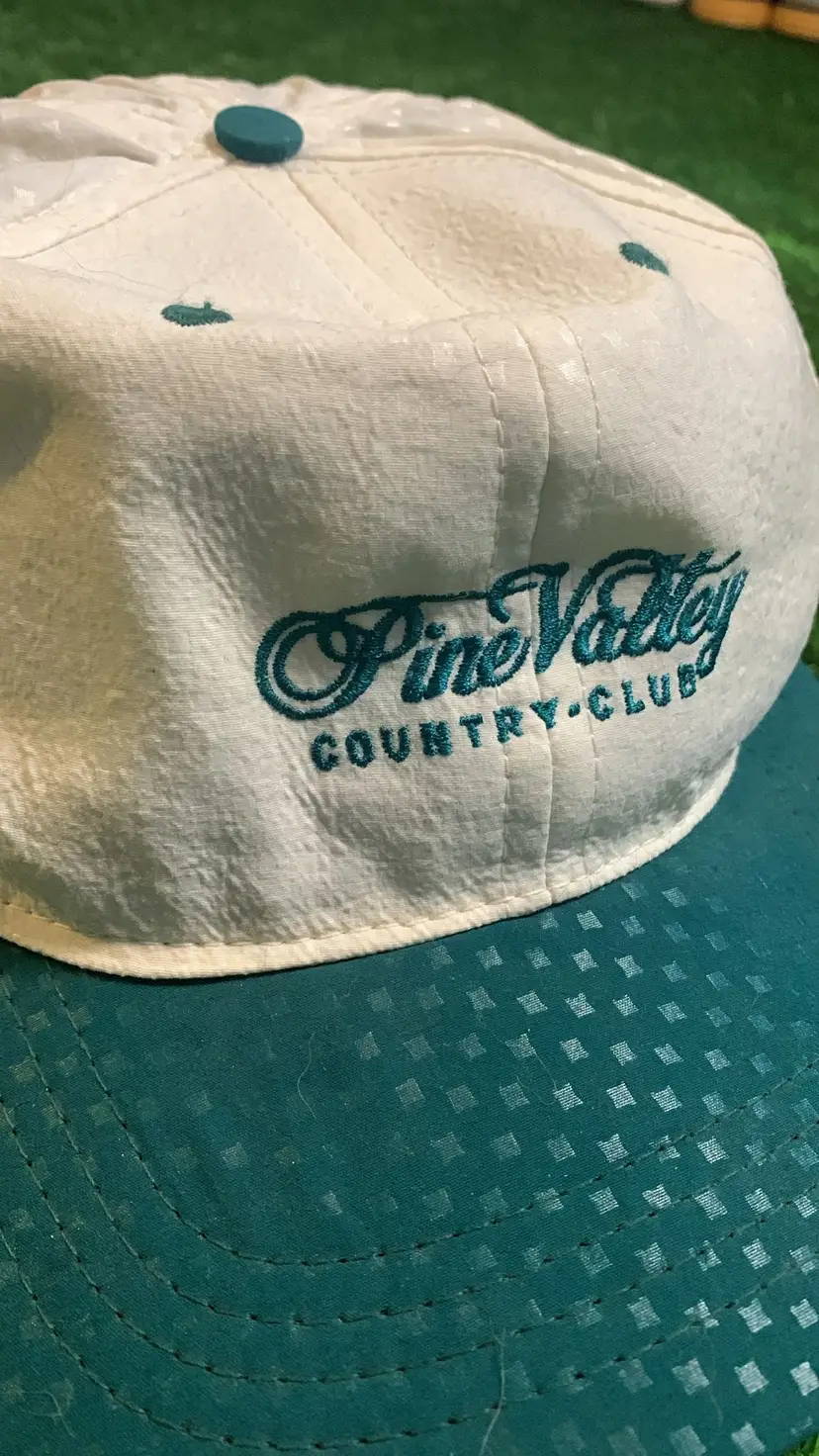 Step into rarefied air with this vintage Pine Valley Country Club cap — a subtle flex for those who know. Featuring a crisp white shell with a deep green brim, this hat doesn’t scream; it whispers old money. A reflective diamond pattern dances across the crown, catching light like a smug nod from a member-only clubhouse.