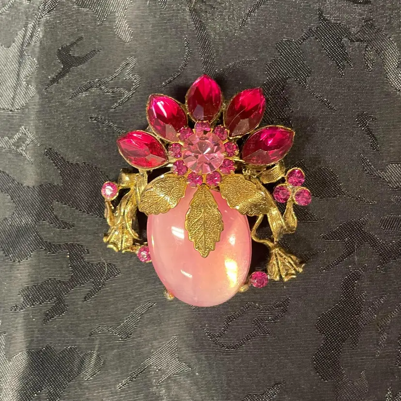 Unsigned Vintage Pink Brooch Measures 2" wide x 2" long In excellent used condition. The large pink stone has a moonstone feel