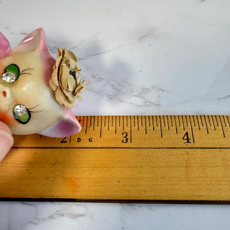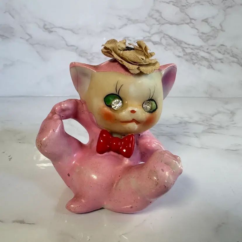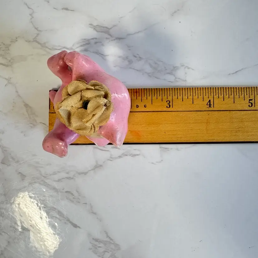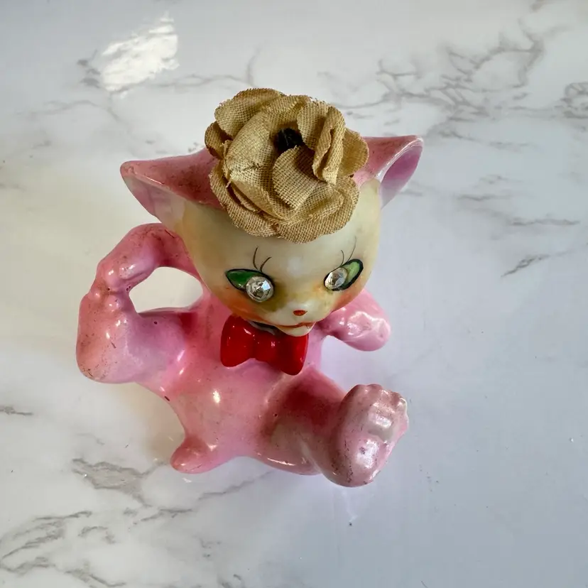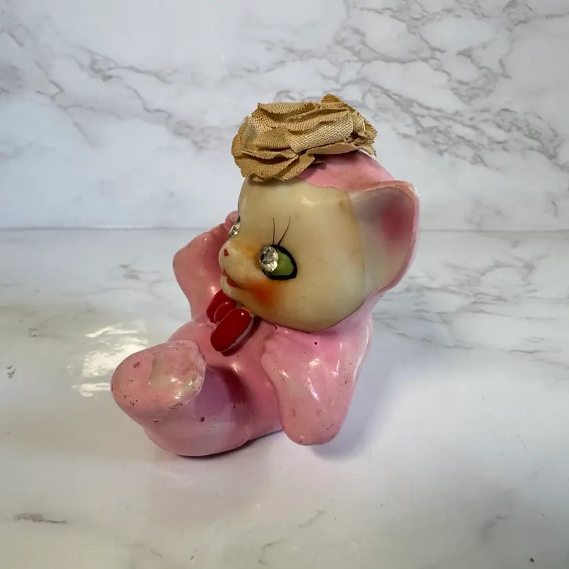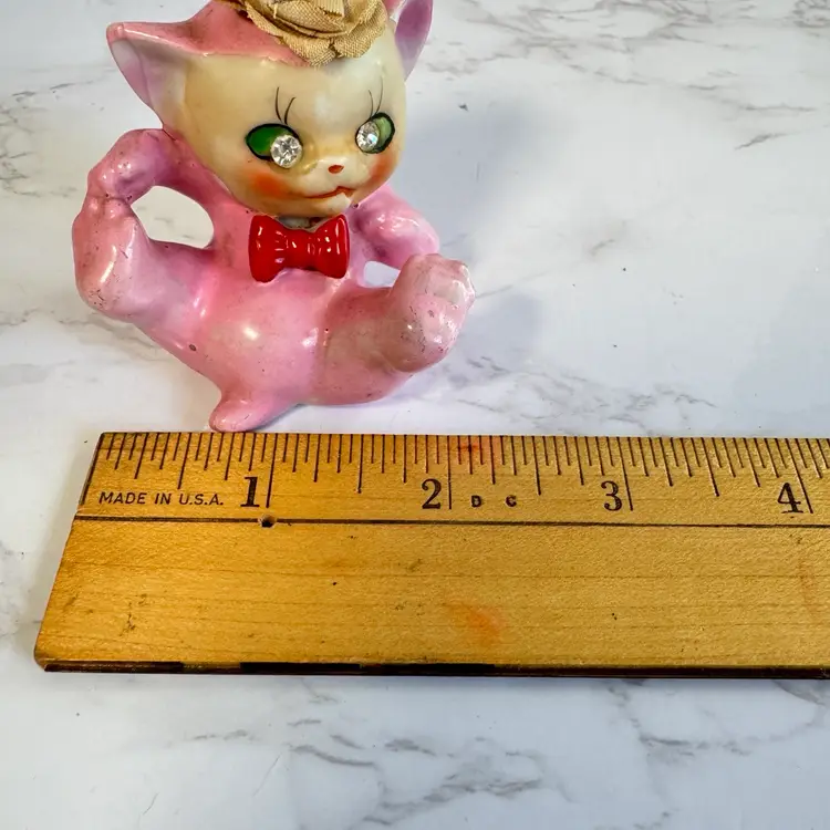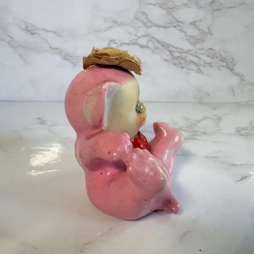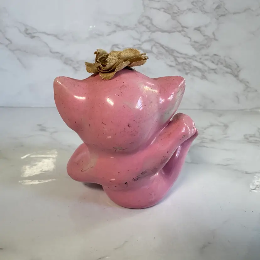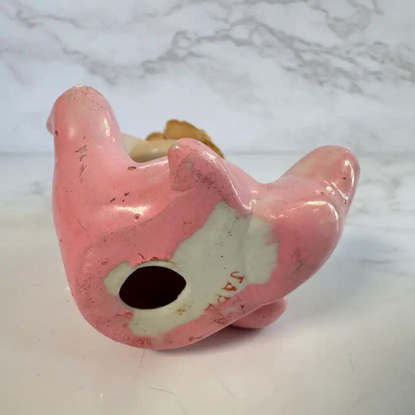 Good vintage condition with some areas of paint loss and some dirt that needs to be removed very carefully. One manufacturing flaw on ear that appears to be a crack but is just a crease in the pottery. Marked Japan on bottom. About 2” x 2” x 2-1/4”h