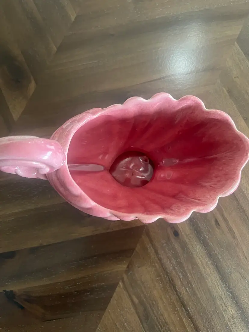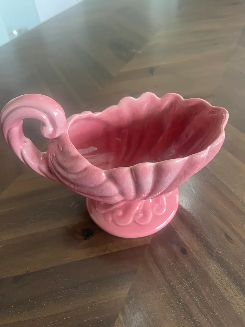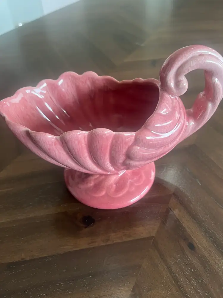 This particular cornucopia shell planter, often produced in a variety of colors including this pink hue, exemplifies the decorative ceramic trends of the mid-20th century. These pieces were popular for home decor, serving as both functional planters and decorative accents, reflecting a taste for whimsical and nature-inspired forms.