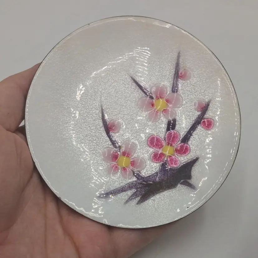 Vintage Pink Cherry Blossoms Japanese Enamel On Copper Plate Tray Dish