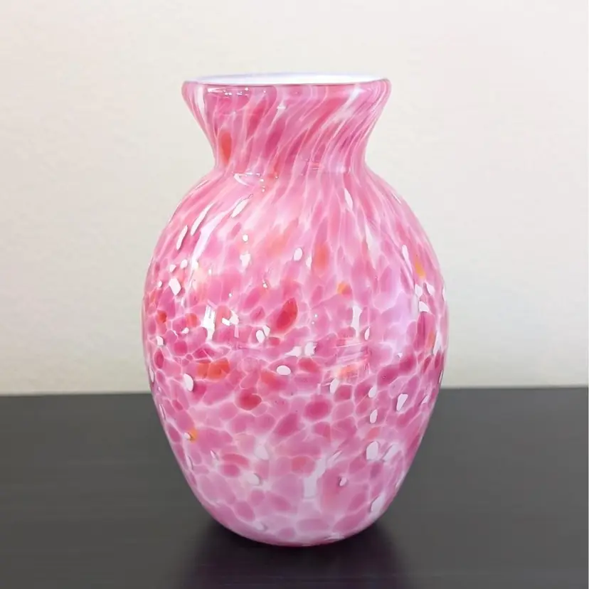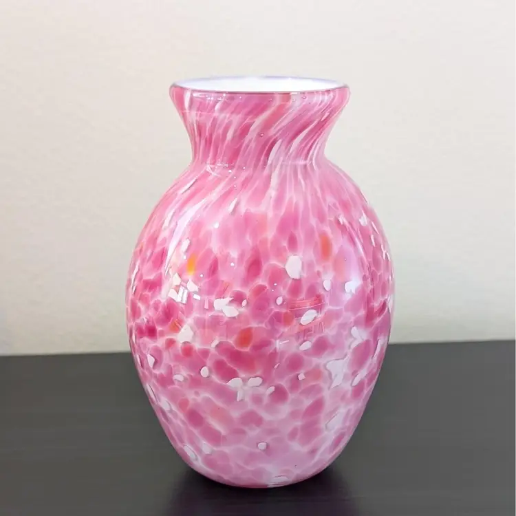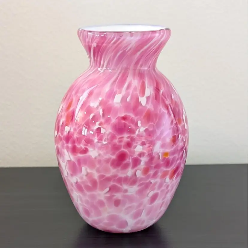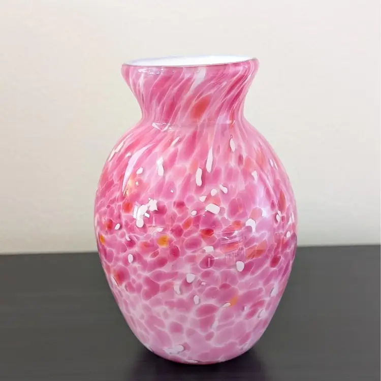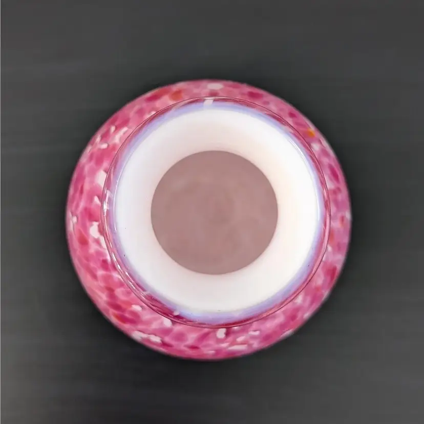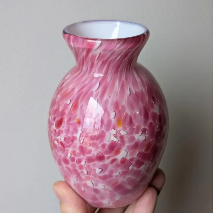 Beautiful vase with a white glass interior cased in a clear glass with a pink, white and orange confetti. In nice, used condition with no chips or cracks.