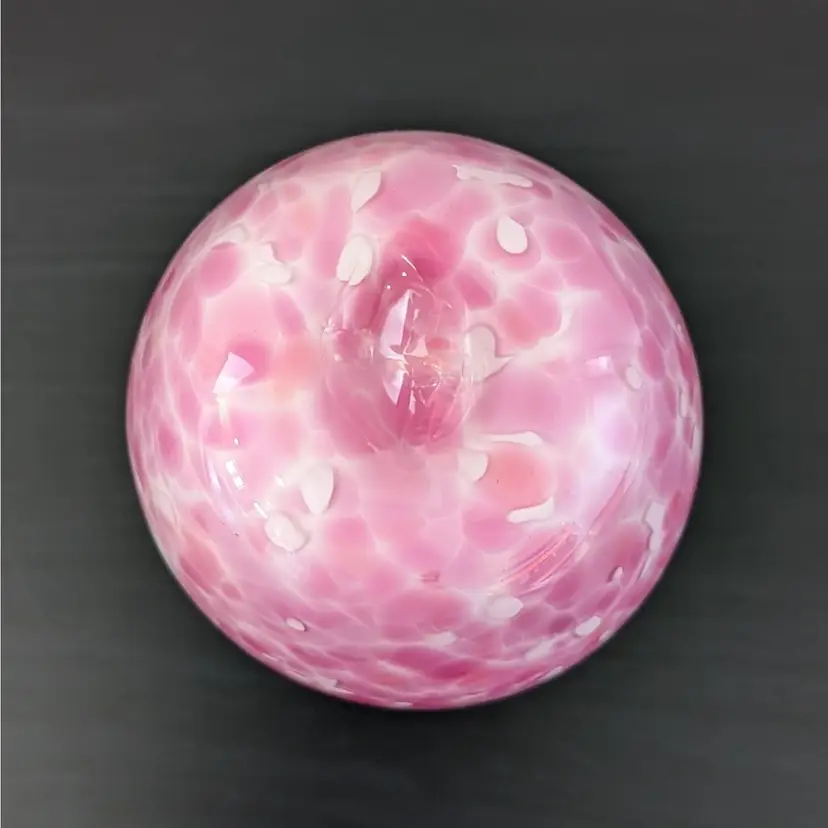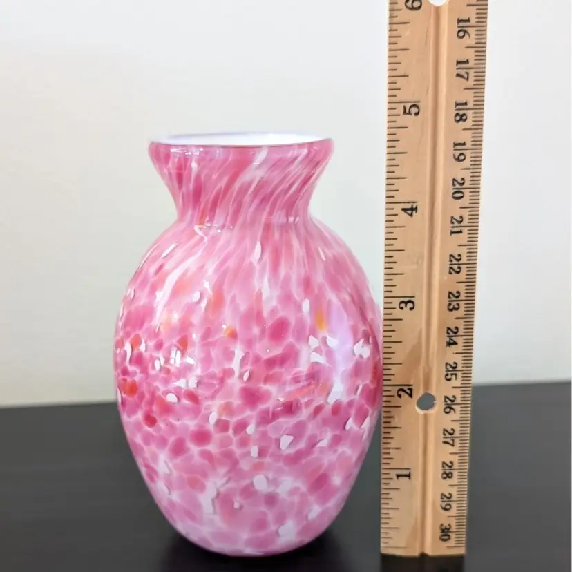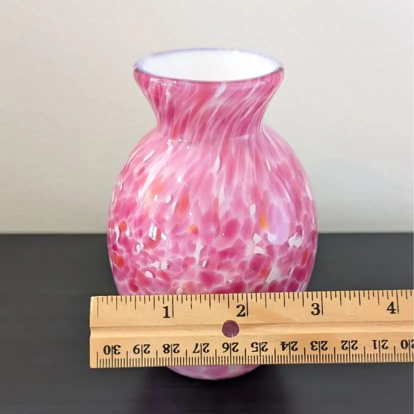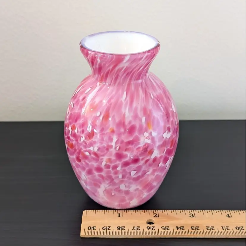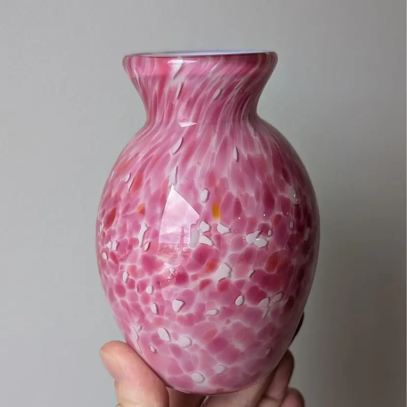 Beautiful vase with a white glass interior cased in a clear glass with a pink, white and orange confetti. In nice, used condition with no chips or cracks.