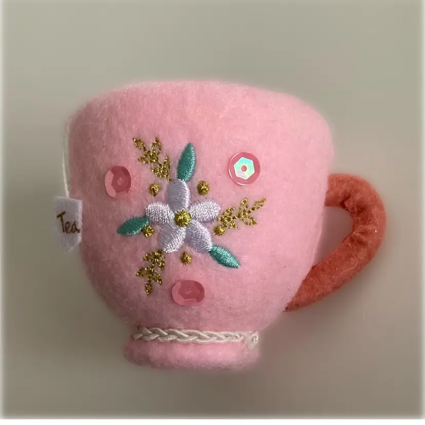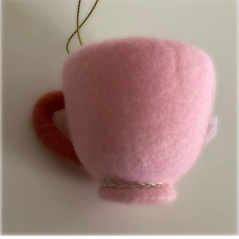 Vintage pink cup of tea felted Christmas ornament. The cup measures 3” tall. From a smoke free home.