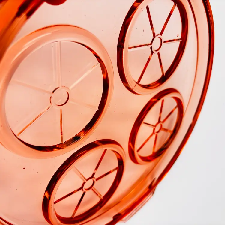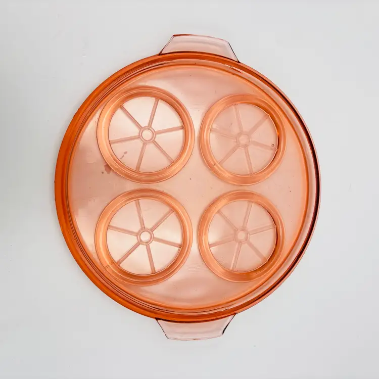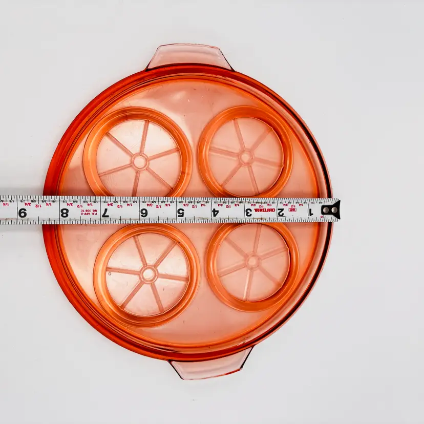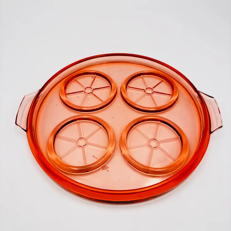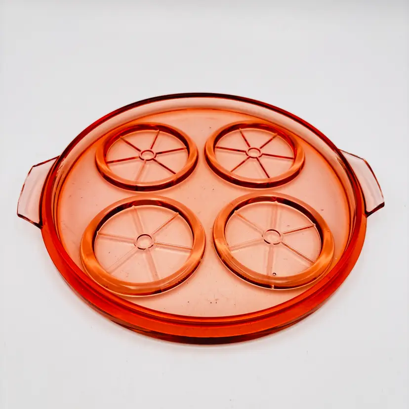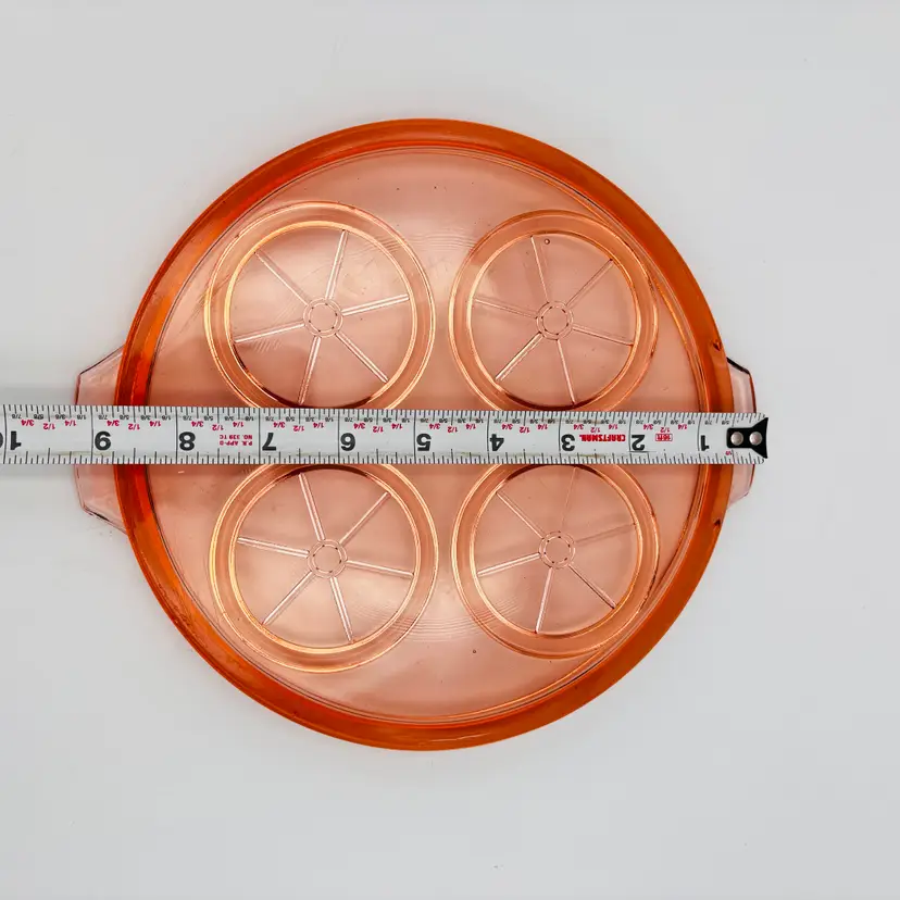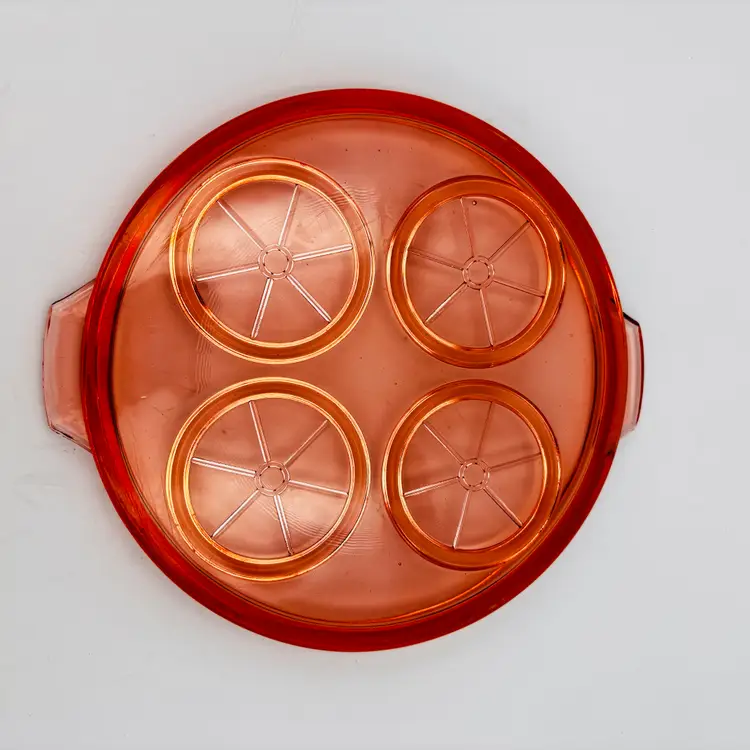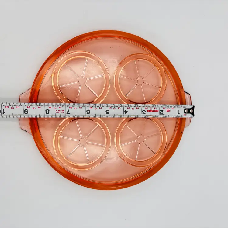 Material: Pressed pink depression glass. Design: Round shape, 9.5in x 8.5in in diameter. Features: Raised rims for holding cups or glasses securely. Era: Commonly produced during the 1930s.