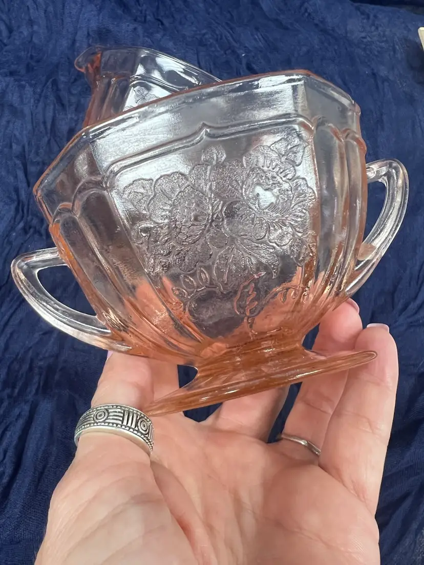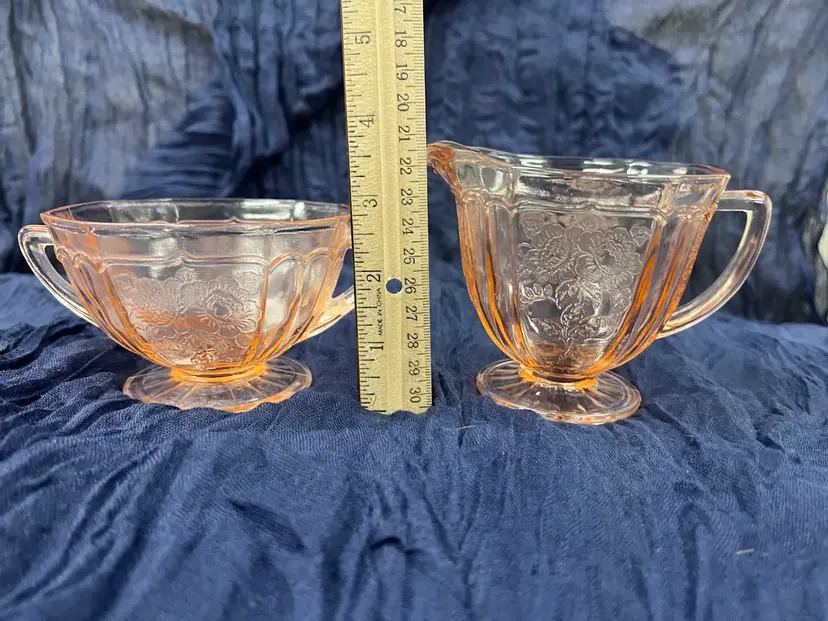 Elegant pink glass creamer and sugar set with floral pressed pattern. Lightweight, decorative pieces that add vintage charm to your table. Easy to display or use for serving cream and sugar. Pink color enhances classic tabletop styling. No chips or cracks.