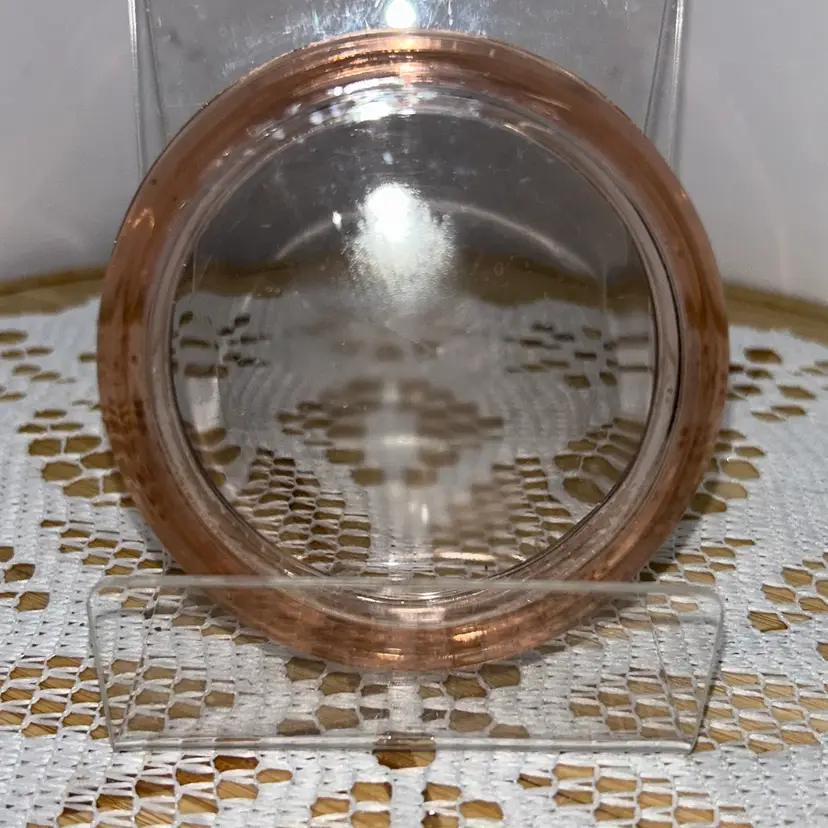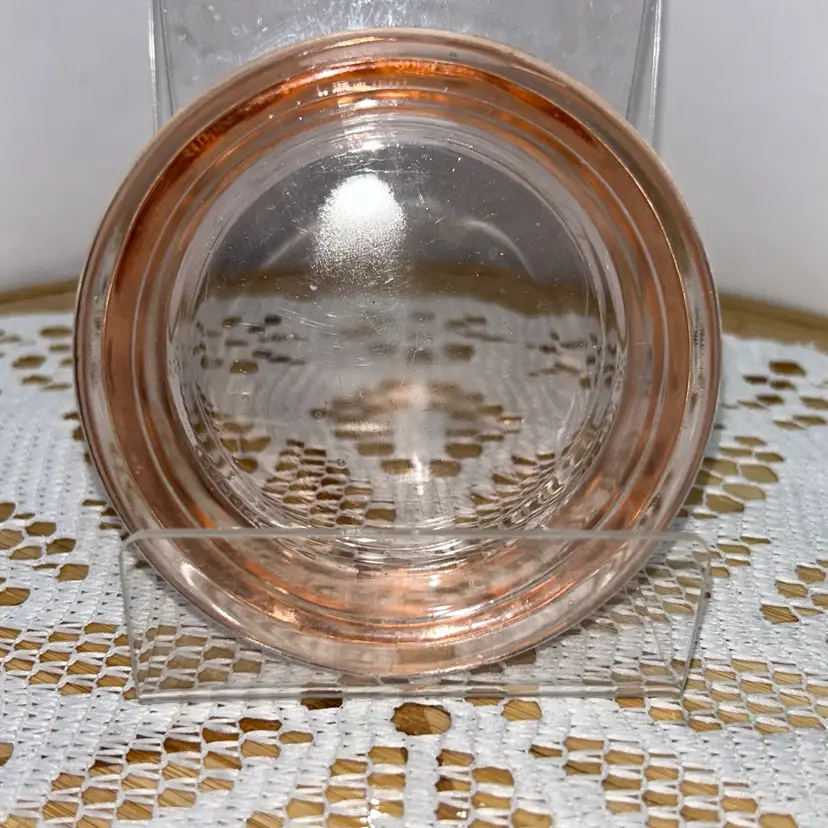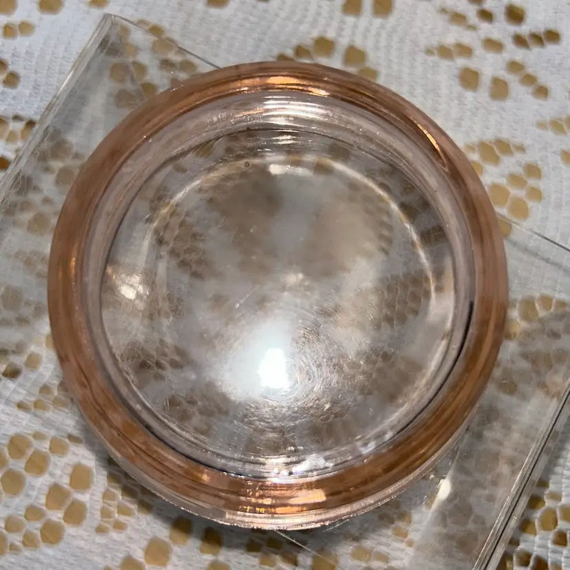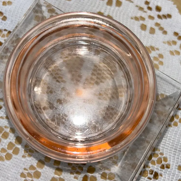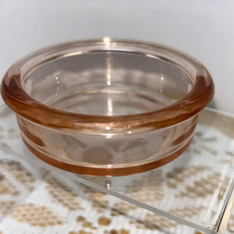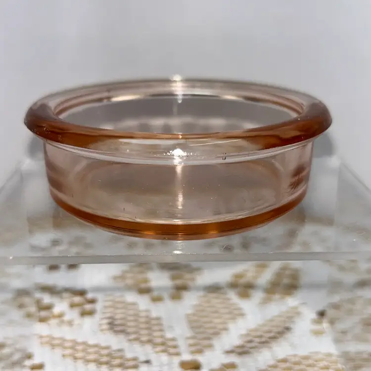 Piece has a lip, but straight sides. Could be a short ramekin, trinket dish, or coaster. Unable to get a positive identification. It is 1” tall, and approximately 3.25” in diameter. Excellent condition. No glow.