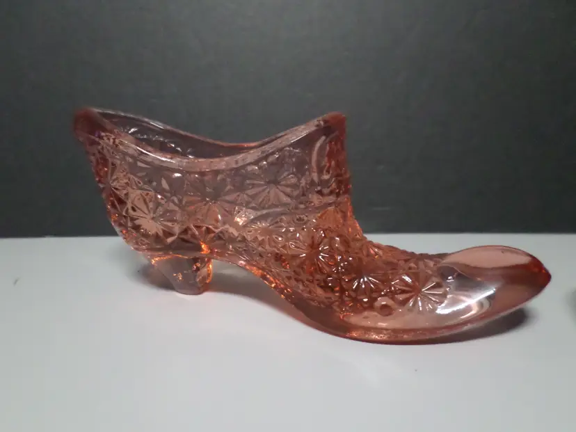 Step back in time with this charming vintage pink glass slipper or shoe figurine, a delightful piece for any collector or lover of antique decor. This pressed glass slipper features a beautiful and intricate textured pattern, strongly resembling the popular "Daisy & Button" design, showcasing small raised daisy or star shapes and button-like elements throughout. The soft, delicate pink hue adds a touch of classic elegance and nostalgia, characteristic of early 20th-century glassware.