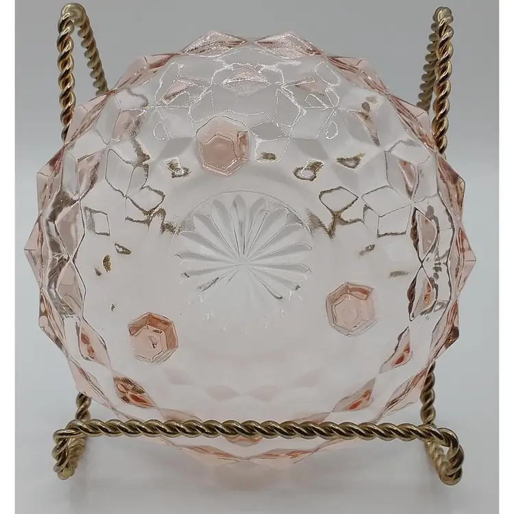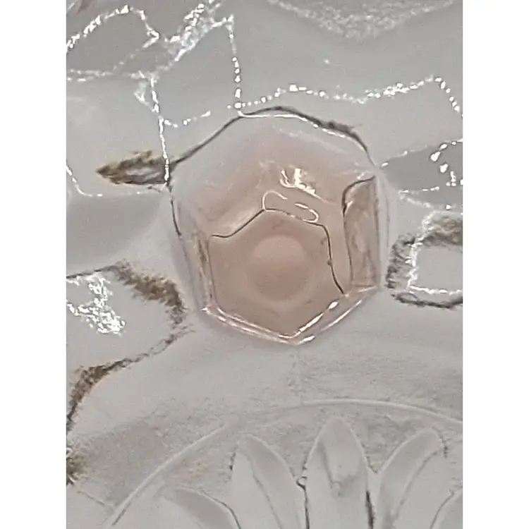 This beautiful pink glass candy or bon bon bowl is approximately 6" deep. It features three feet on the bottom and it is a cubist design. The bowl is 2 1/2" tall and is 6 1/4" in diameter. This piece is absolutely beautiful and has no chips or cracks. I have taken pictures from all angles but if you need additional photos, please let me know.