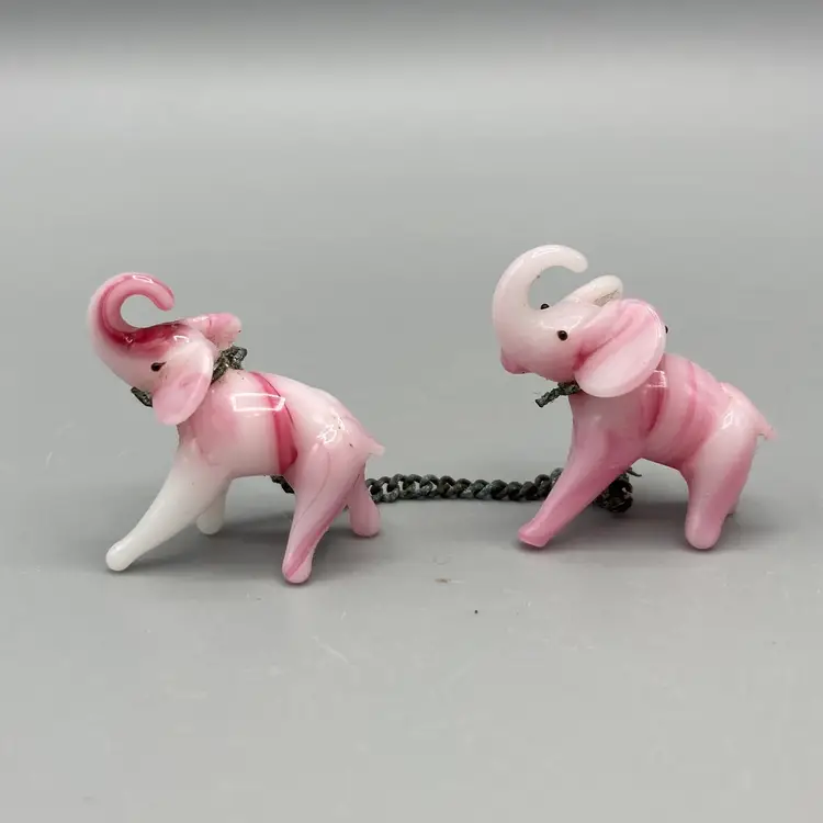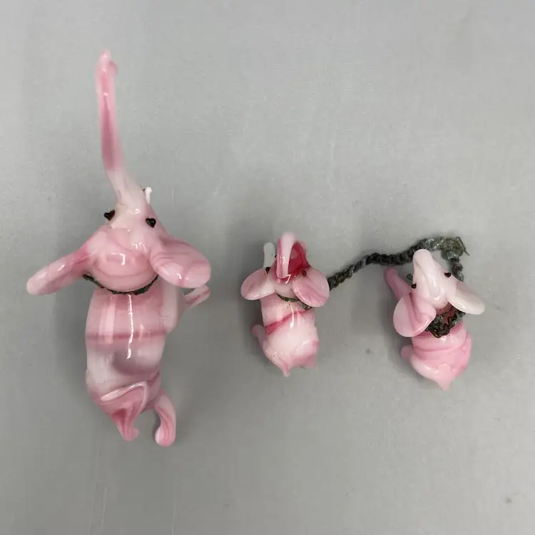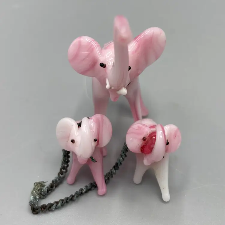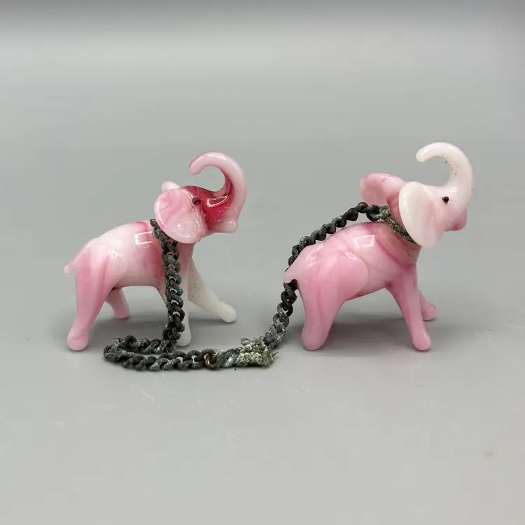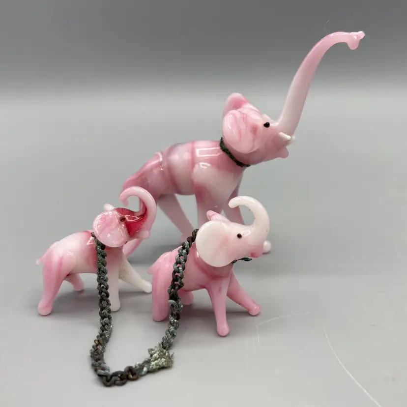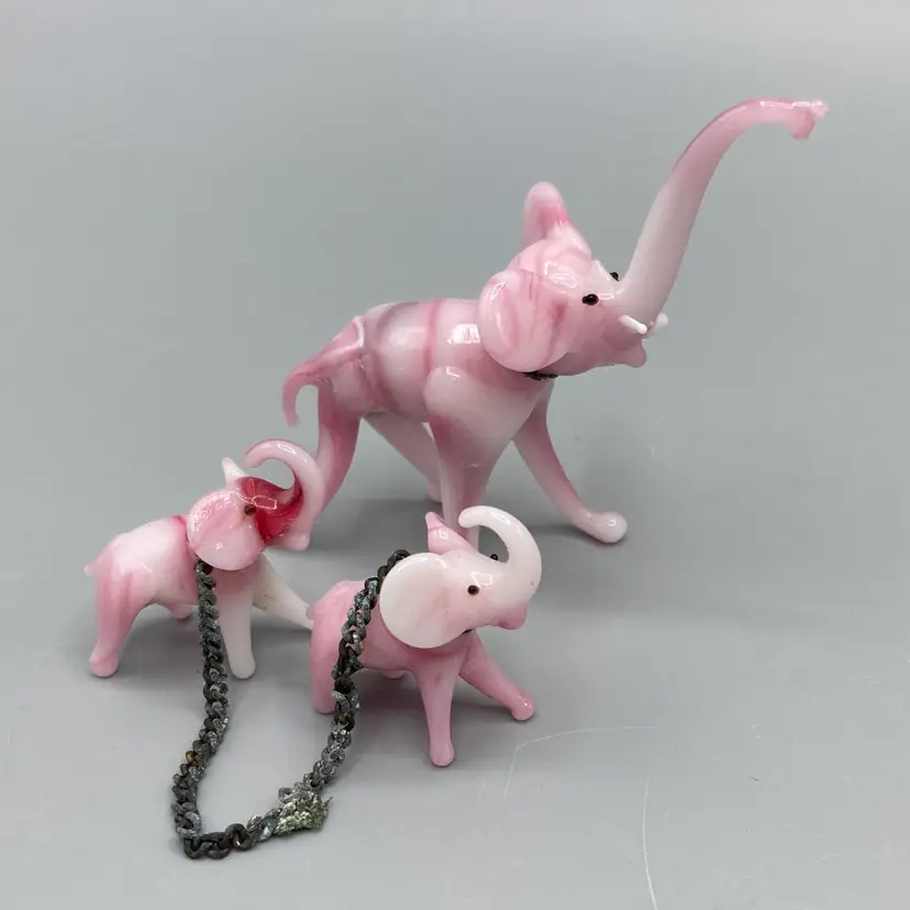 These glass elephants are in good overall condition; the chain has broken off of the mother elephant and the chain overall is fragile and has patina. The mother elephant measures approximately 2 1/4" tall x 2 1/2" x 1". The baby elephants measure approximately 1" tall x 1" x 1/2".