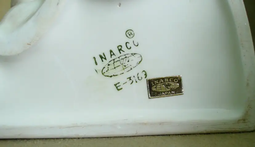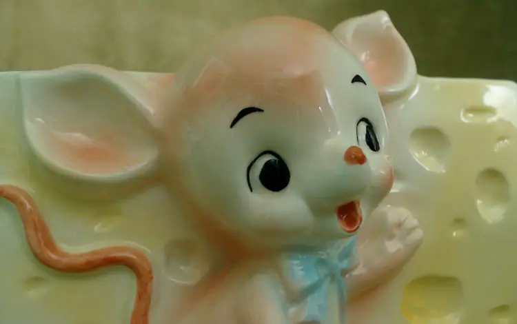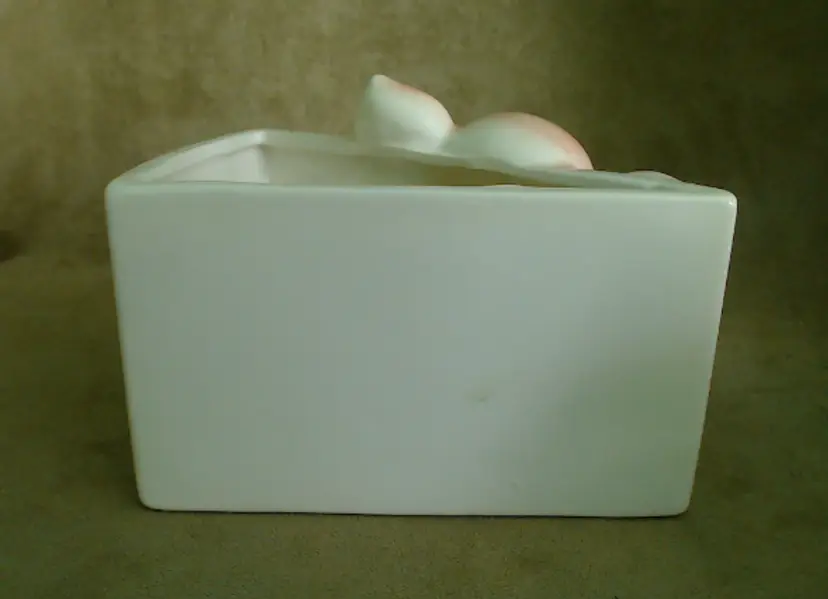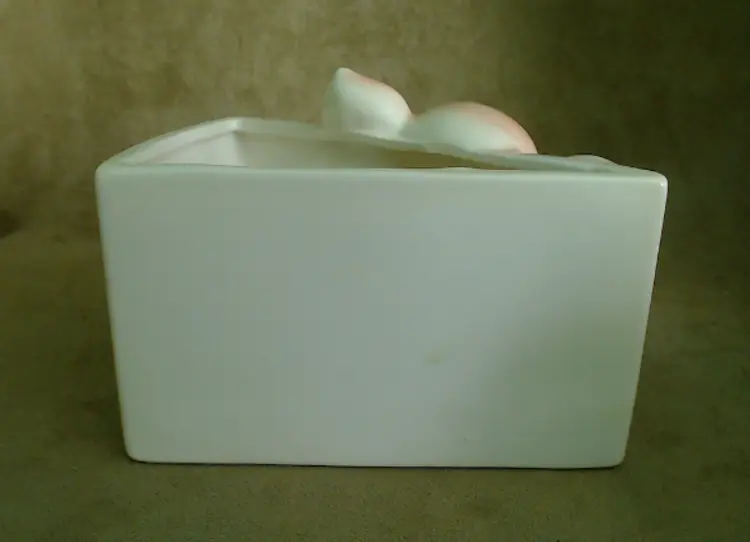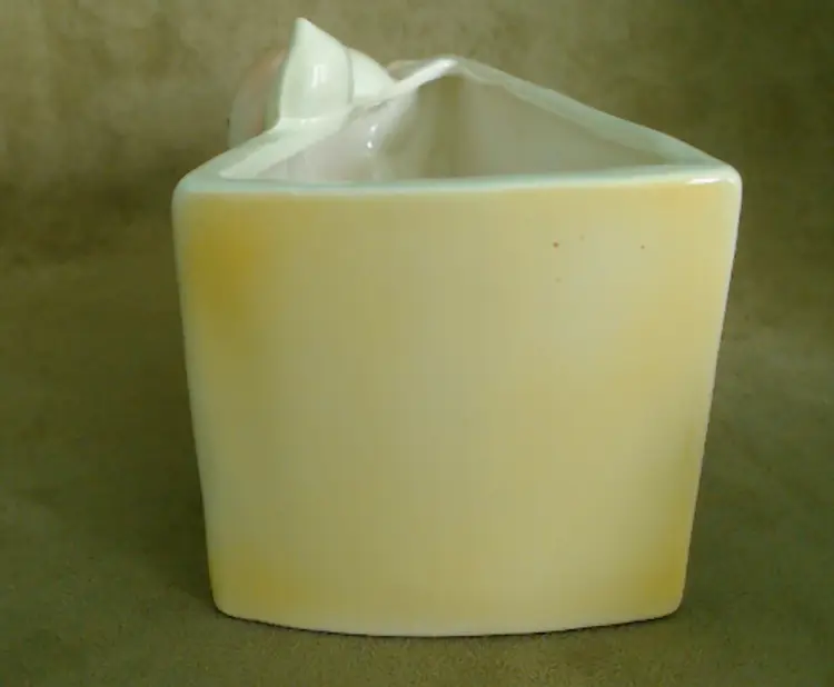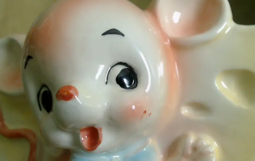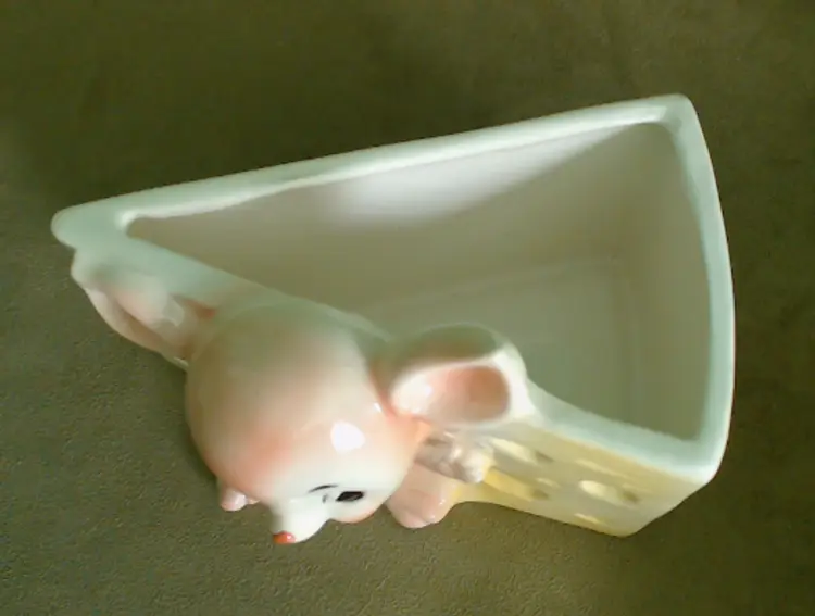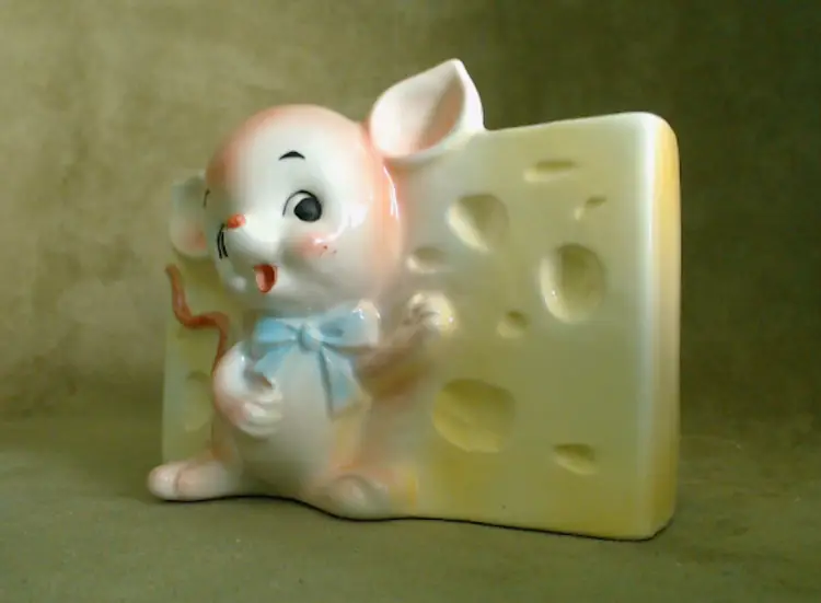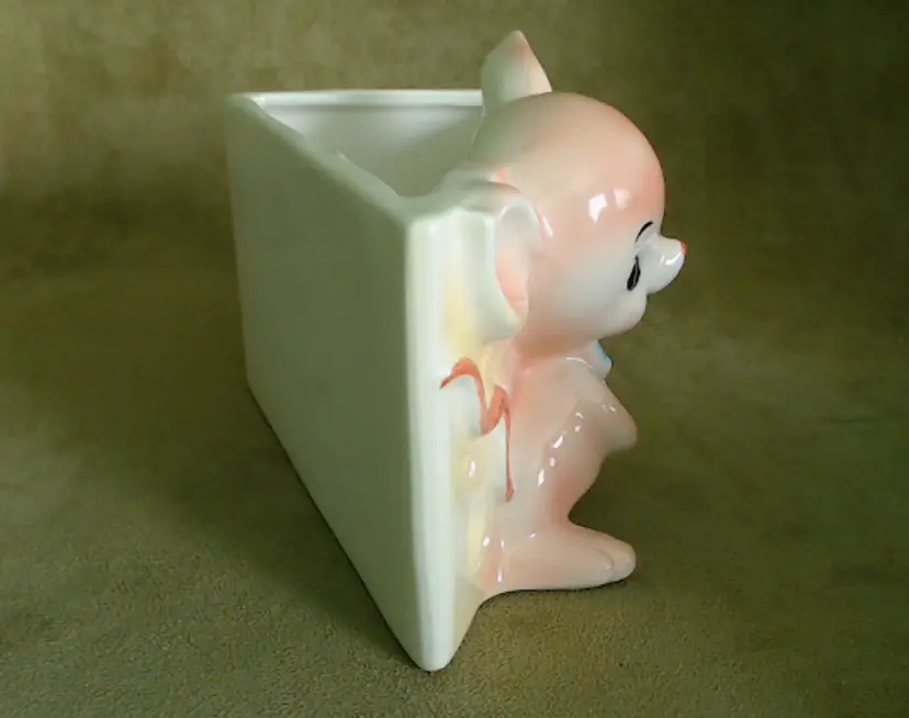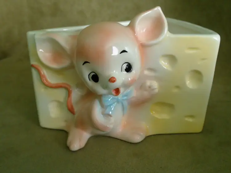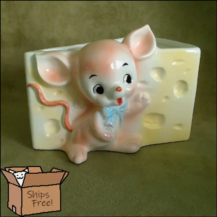 This is a vintage planter, adorned with a cute little mouse! Made in Japan during the 1960s, for Inarco, this mouse with his big cheesy prize was intended to be a nursery planter, given to a new mom or a mom-to-be. The soft pastel colors would indeed look perfect in a baby's room, but this little cutie would also fit well in a kitschy animal collection, or even in the kitchen, where he might come across even MORE cheese! Condition: This planter is in Excellent shape! There are no chips, cracks, or any other damage that I could find. Even the interior is nice and clean, which is such a rarity for a planter! The only thing I found was just the tiniest smudge of extra pink on his cheek, left over from manufacturing. I really can't even call that an issue! Size: This piece measures about 4" across the widest point, is about 5¾" long, and stands just under 4½" tall. The actual planter portion is wedge shaped, measuring about 3" across the widest point, narrowing to just ¼" at the small end, is 4¾" long, and about 3" deep. Not a bad size for a vintage planter!