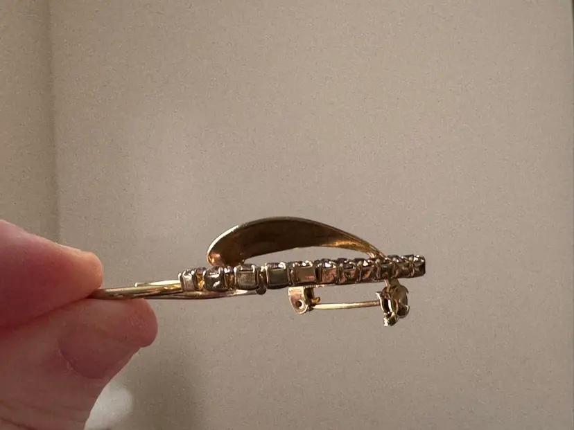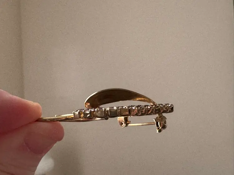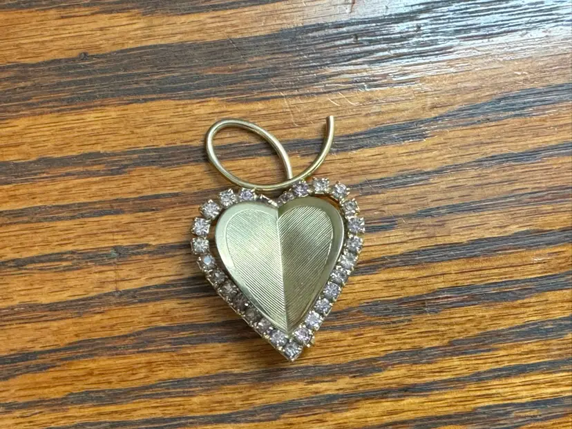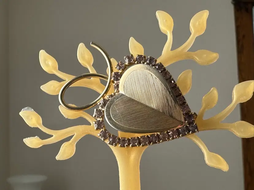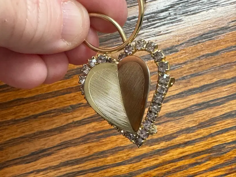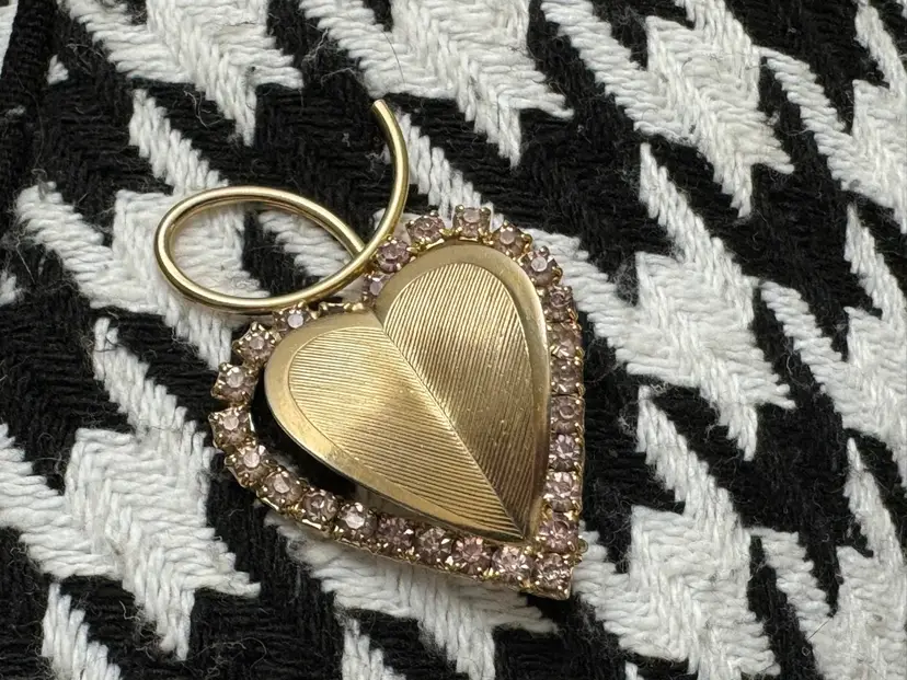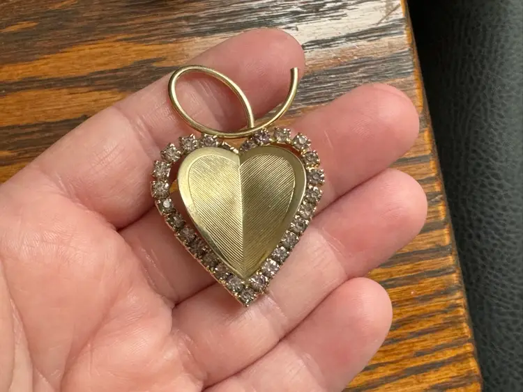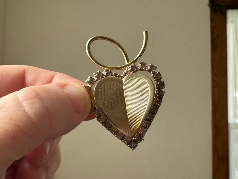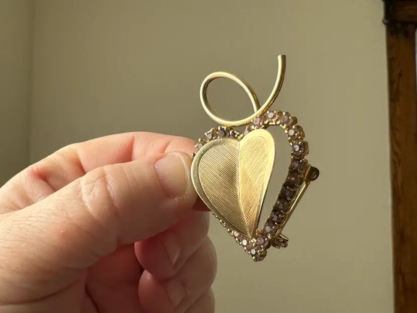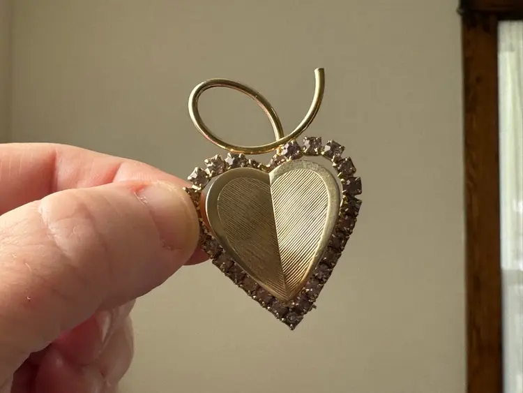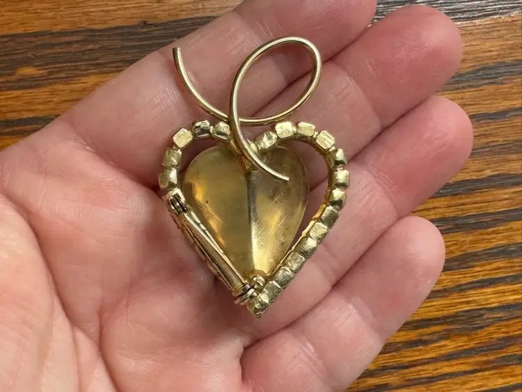 Vintage pink rhinestone 3-D heart brooch in gold tone metal. Perfect for Valentines Day