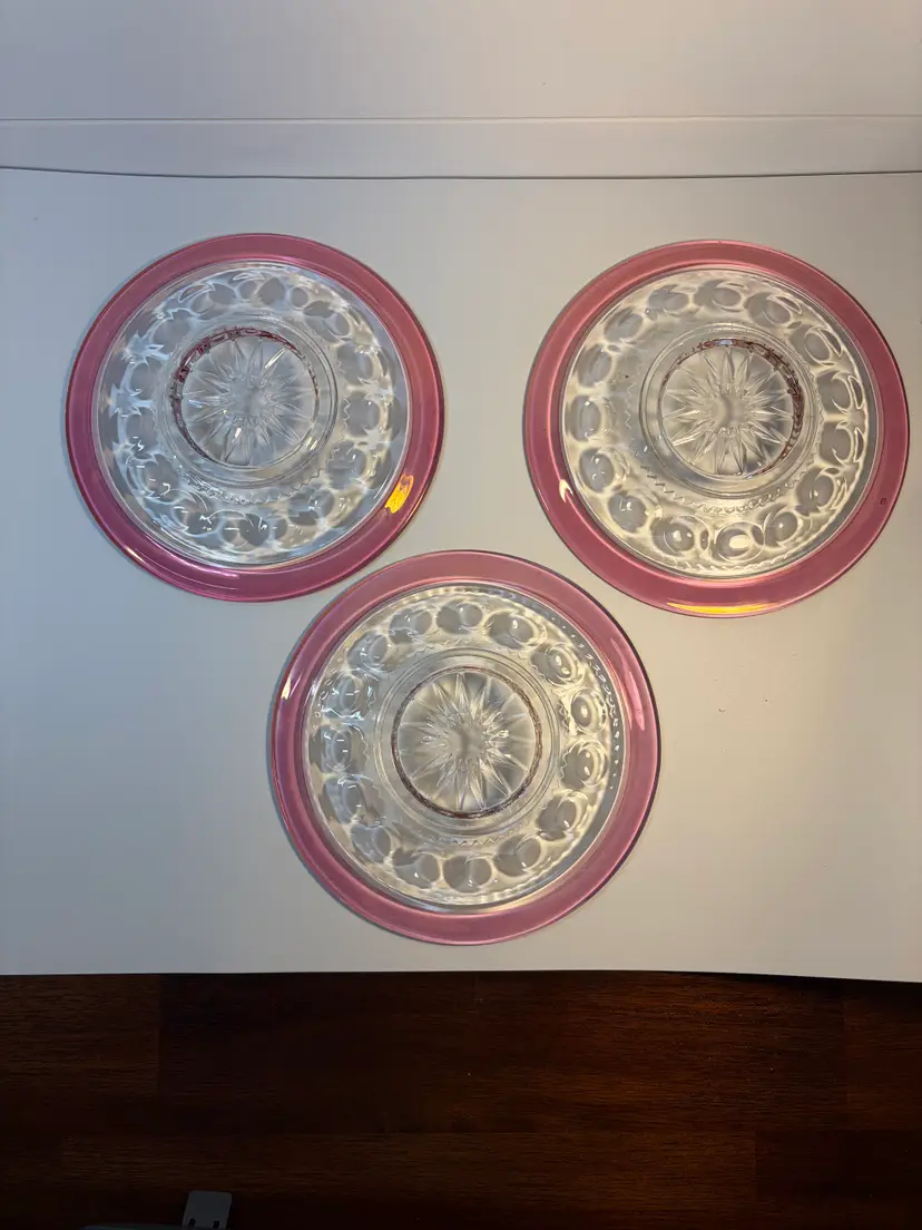 Set of three charming pink King's Crown glass plates with intricate patterns. Perfect for adding a touch of vintage elegance to your table setting. 7.25 inches in diameter. No chips or cracks.