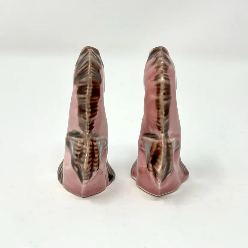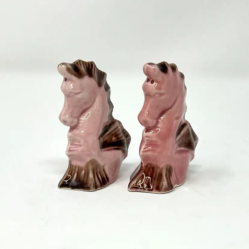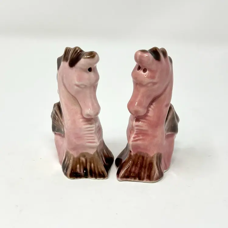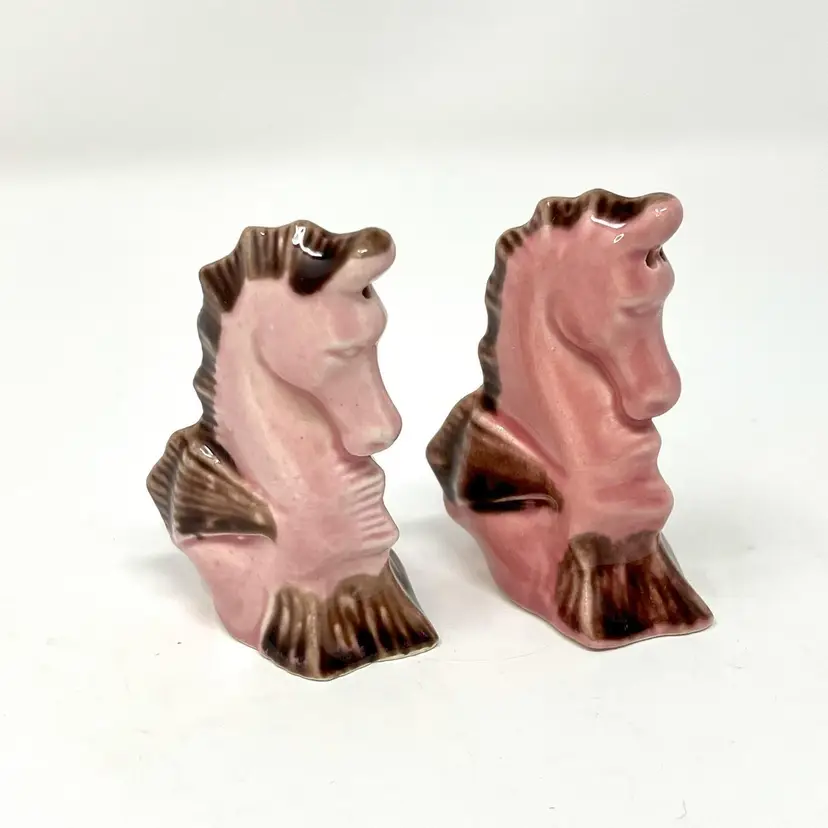 Vintage pink seahorse salt and pepper shakers, mid-century ceramic coastal decor. Perfect retro beach house collectible and unique kitchen gift set.