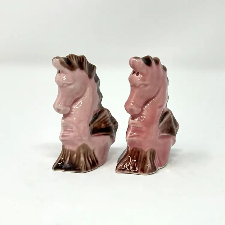 Add a splash of coastal charm to your kitchen with this vintage pink seahorse salt and pepper shaker set. Crafted from ceramic in the mid-century era, these shakers feature delightful hand-painted details that evoke the relaxed beach house vibe. Perfect for collectors or anyone looking to enhance their kitchen with unique retro decor.