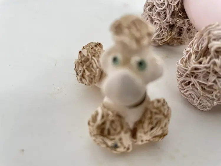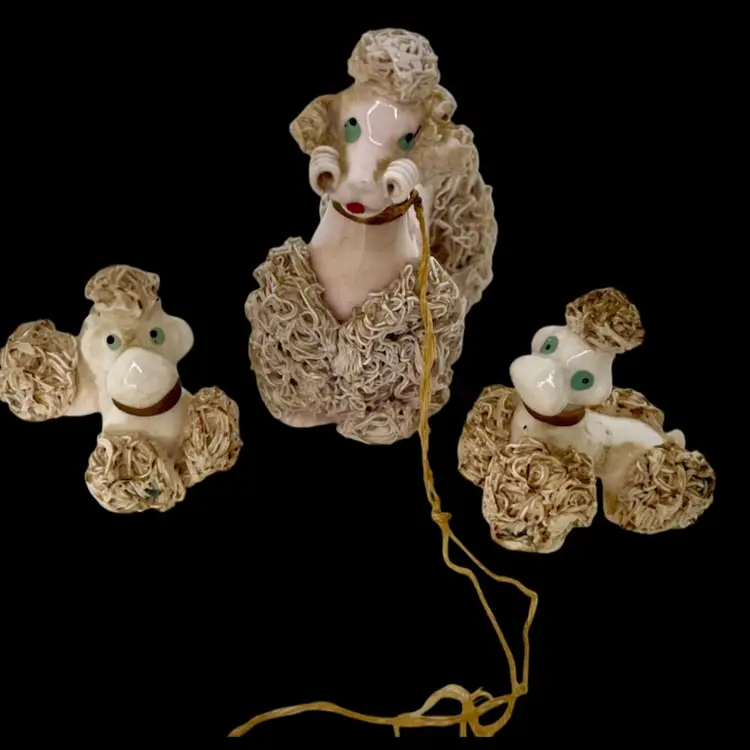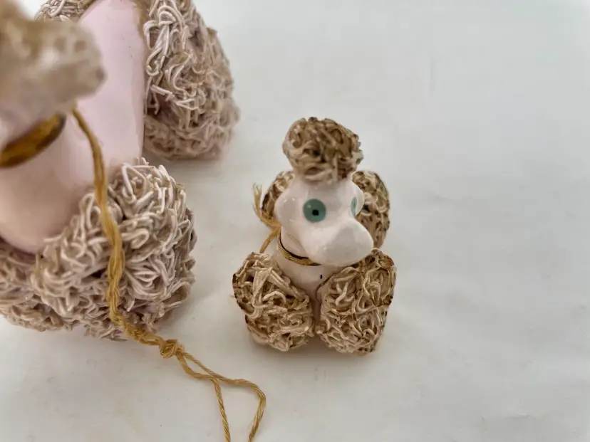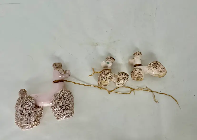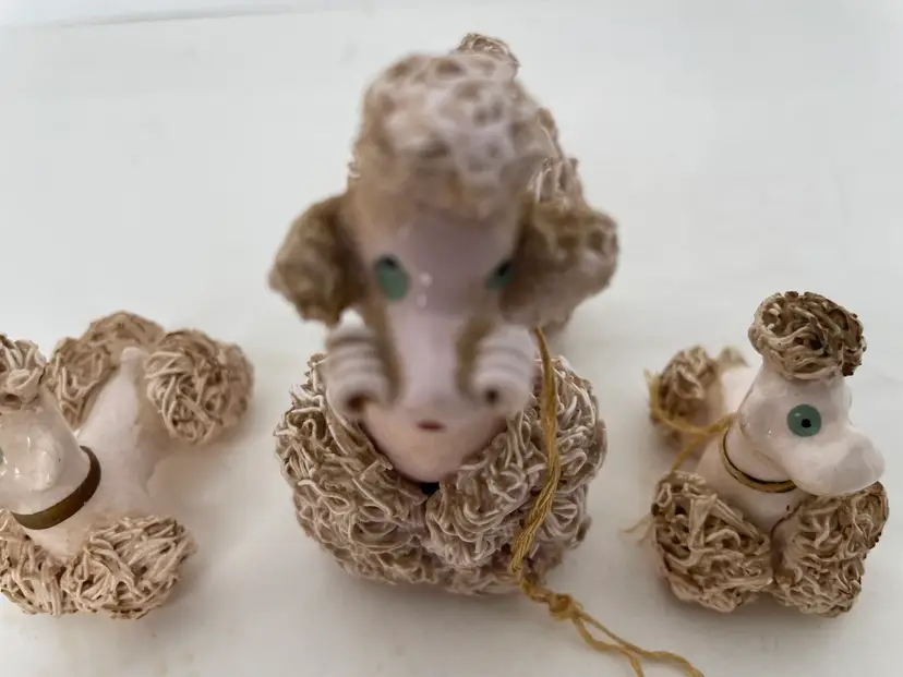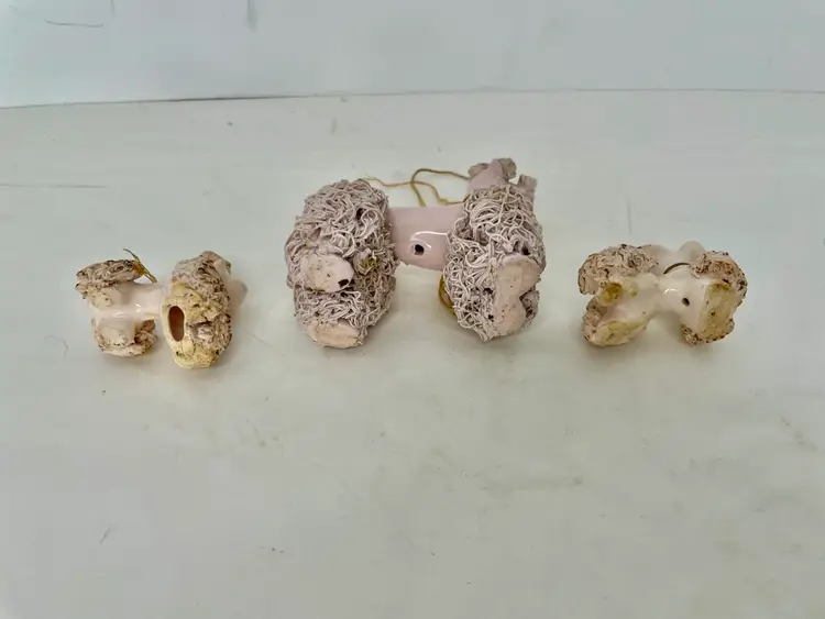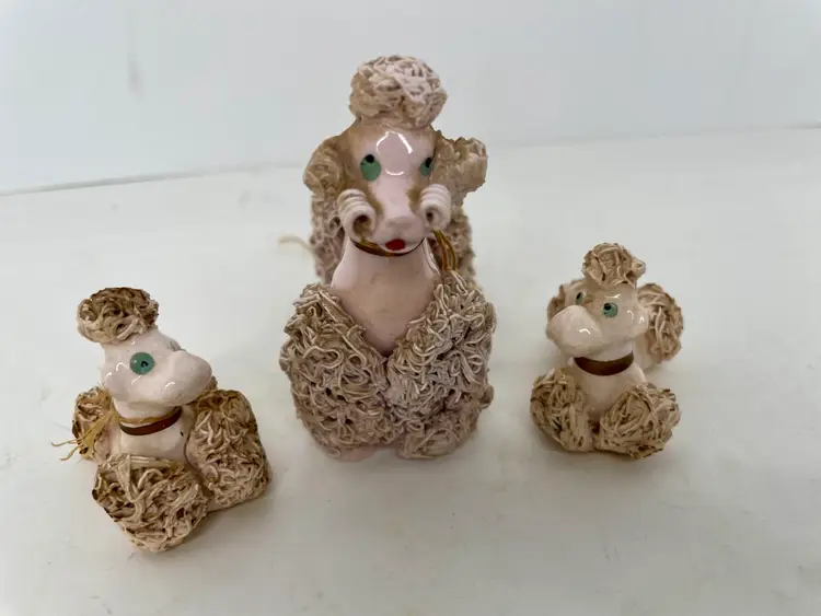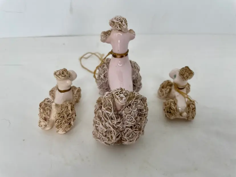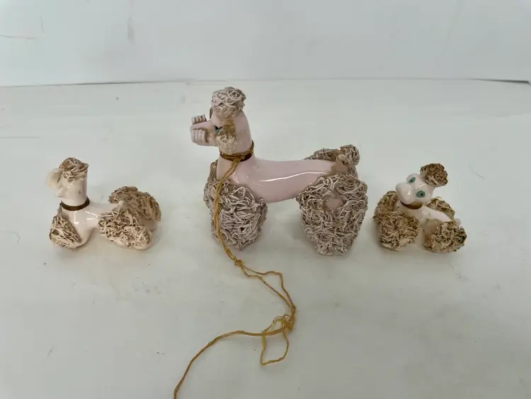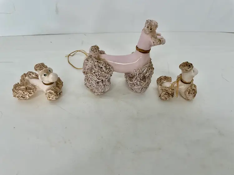 This vintage figurine set features a charming pink spaghetti poodle family, including a mom and 2 puppies - all with blue eyes. Made of porcelain and originating from Japan, this kitschy cute collectible captures the playful and adorable essence of poodles. Perfect for dog lovers and collectors alike, this figurine adds a touch of nostalgia and whimsy to any home decor.