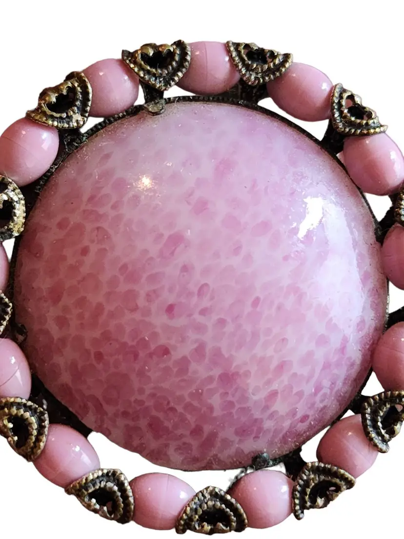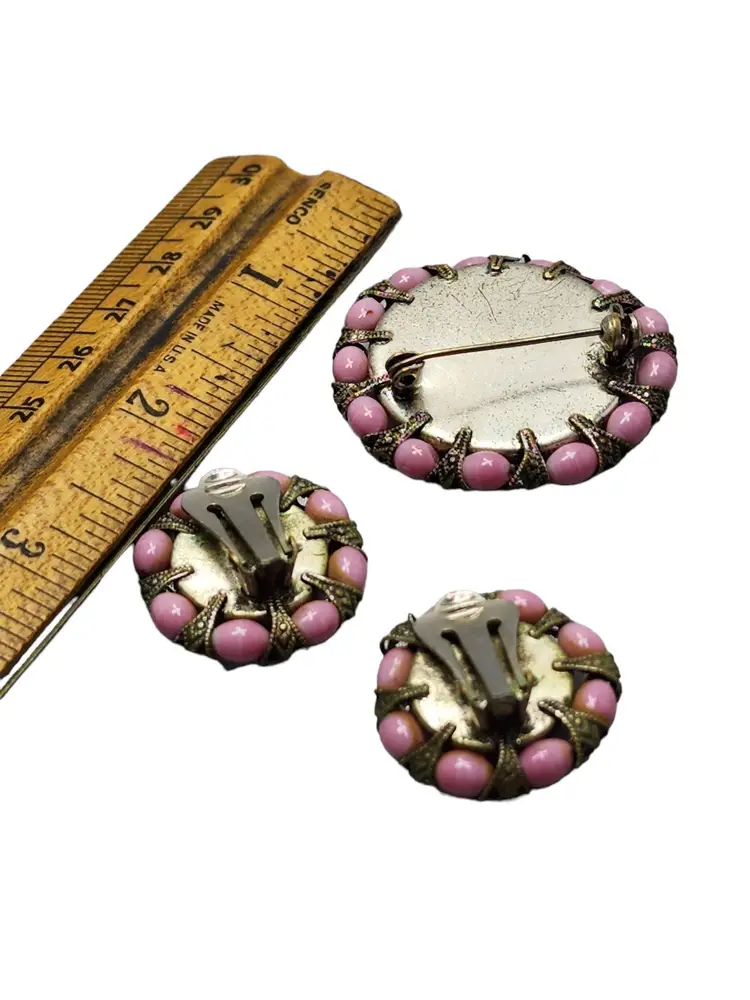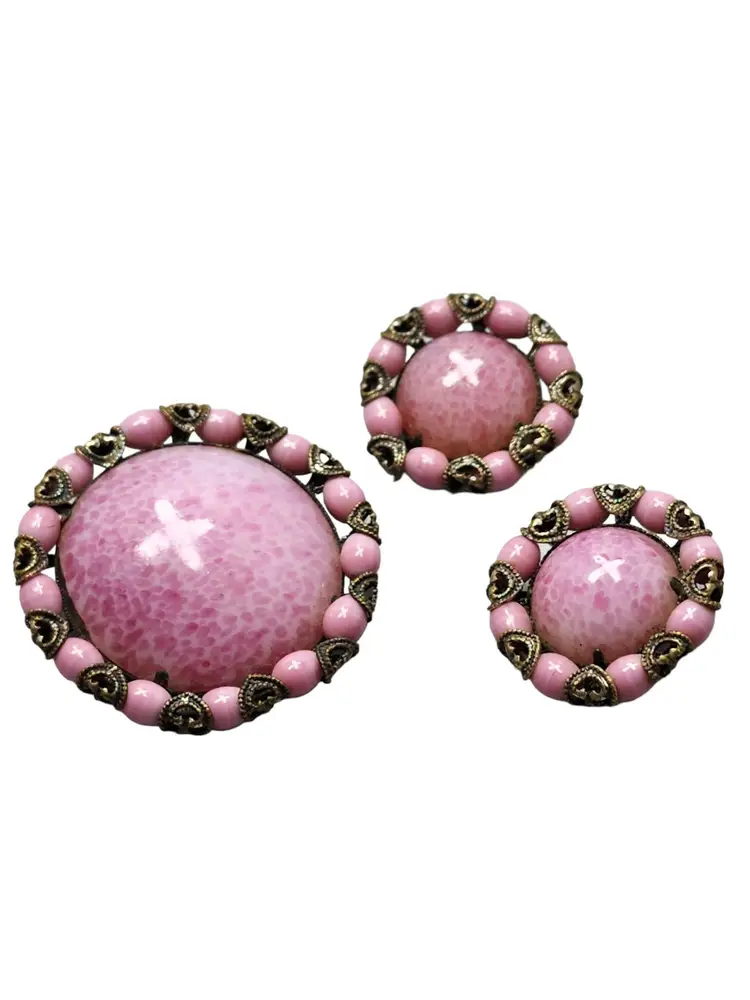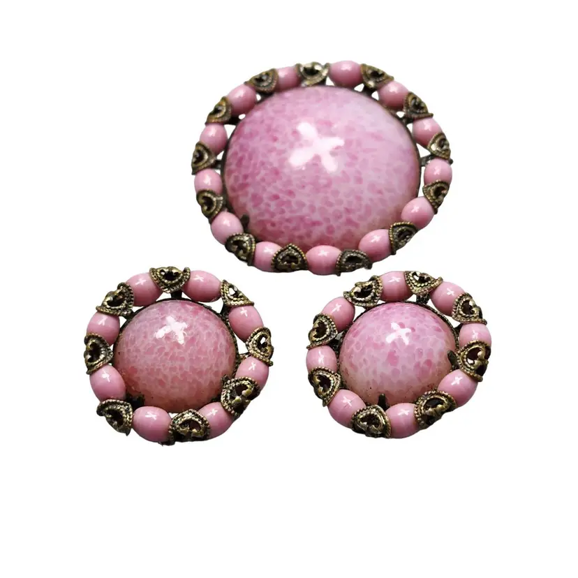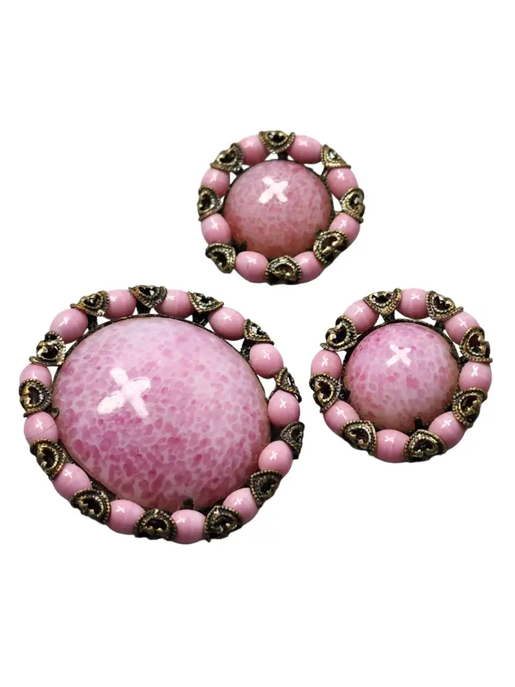 Vintage Pink Speckled Czech Glass Brooch and Earrings Set (A1444)