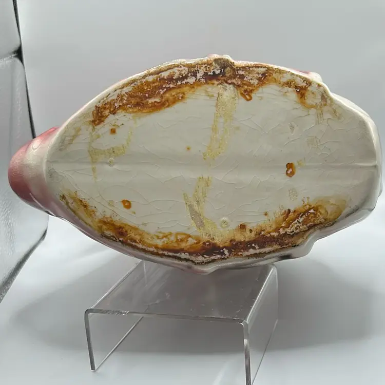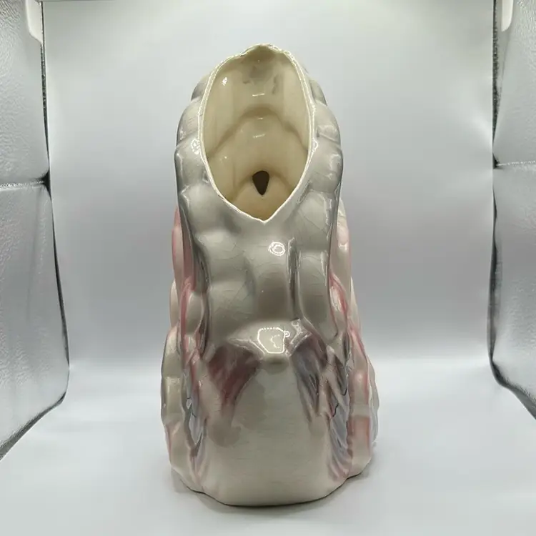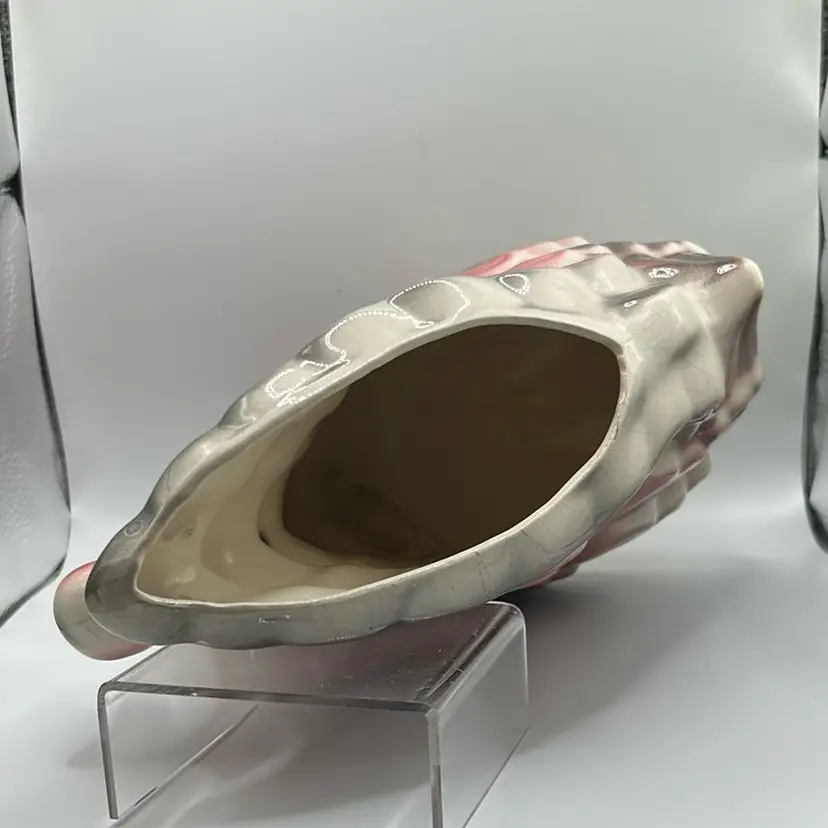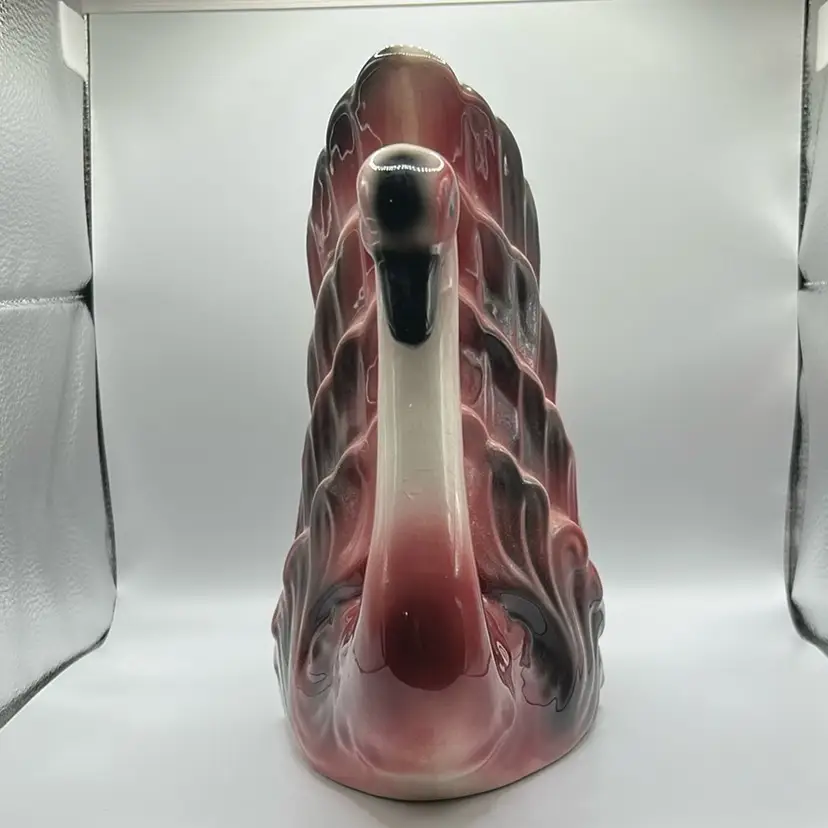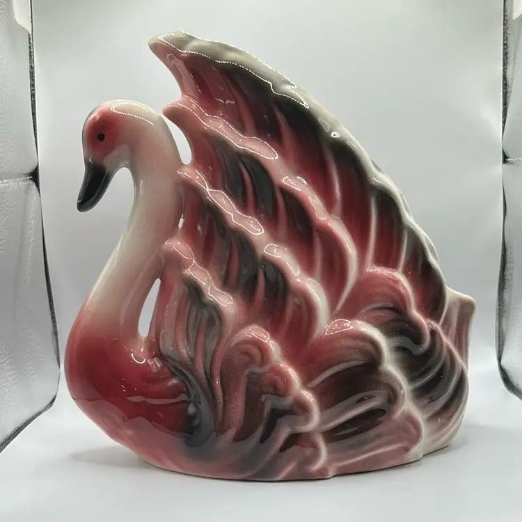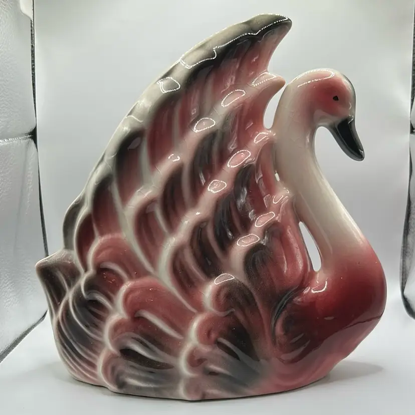 This piece is a vintage ceramic swan planter. It has intricate detailing which emphasizes its wings and neck. This piece can also be used as a vase. This thing is 9 inches tall and 8 inches across. There is some crazing, but there are no chips or cracks.