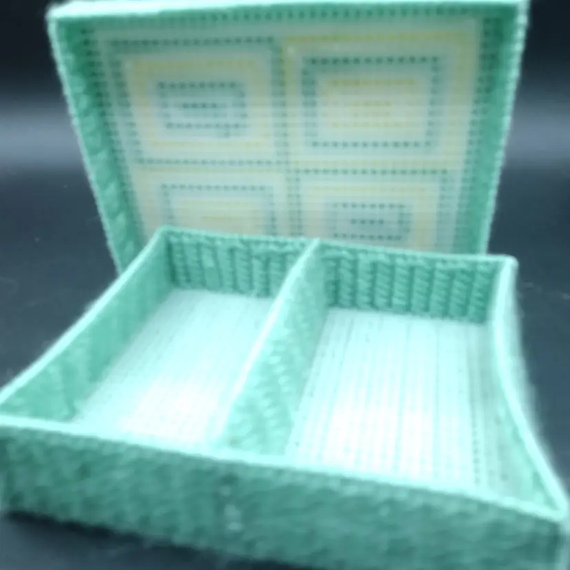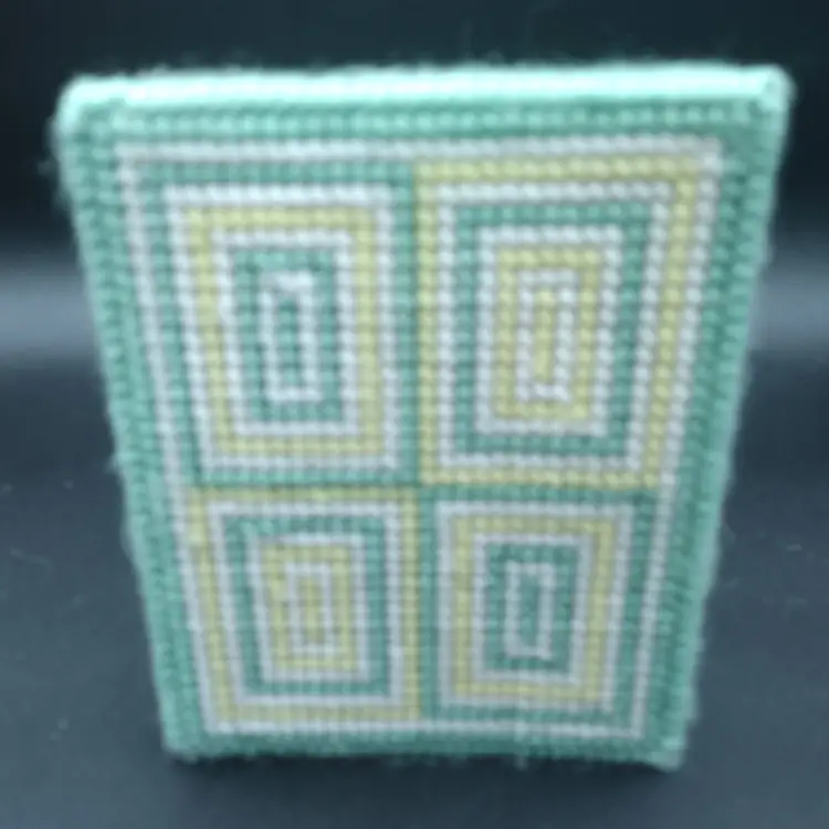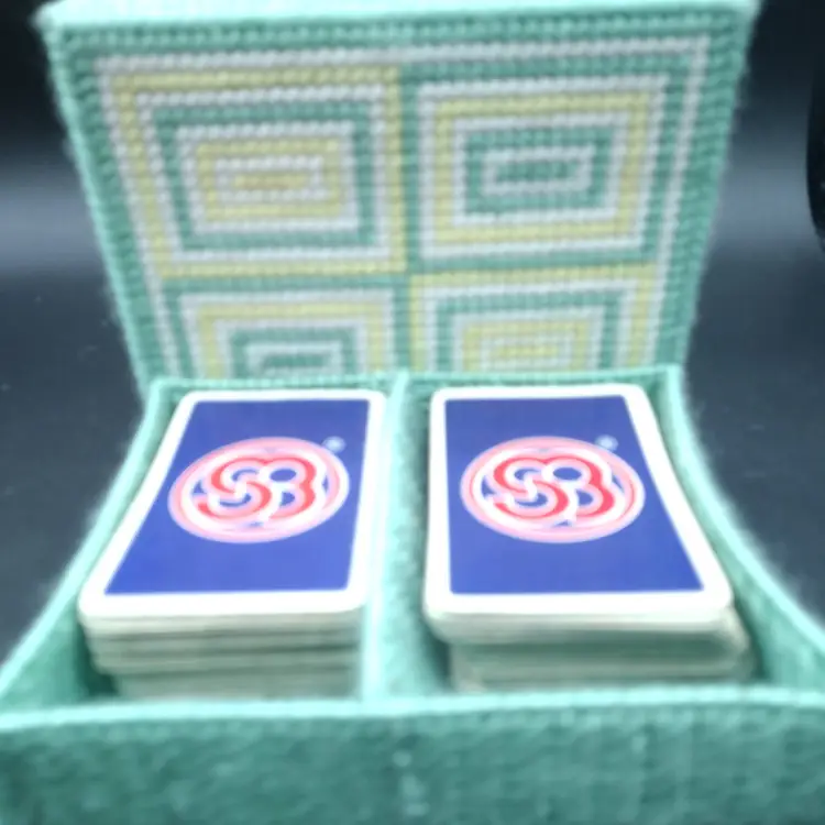 This product is a vintage plastic canvas double playing card deck holder or box, which is handmade. The box is designed to hold two standard decks of playing cards securely in place, making it convenient for organizing and storing the cards for easy access during games or card tricks. The plastic canvas material adds durability and a classic touch to this functional and stylish accessory for card enthusiasts. The Cards in the box have NOT been checked to see if they are complete.
