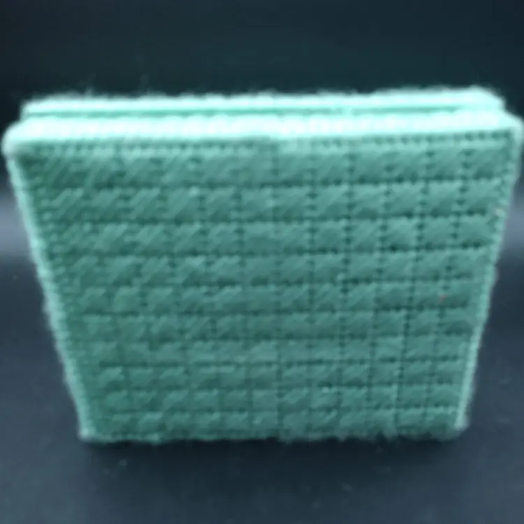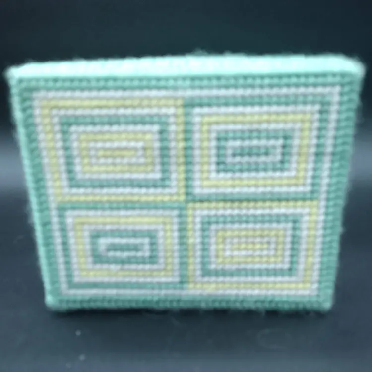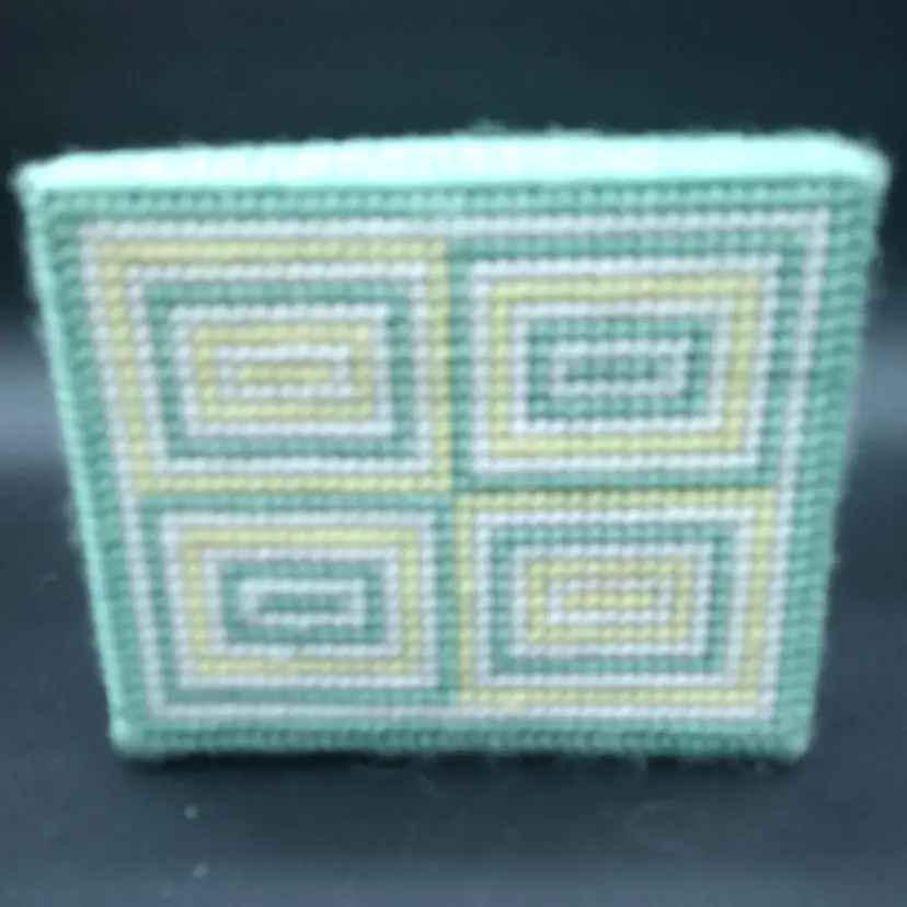 The yarn used are green, yellow and white. The box measures 6 x 5 x 1 3/4 inches. Preowned: This item is in overall good condition with one small area of thread loose.