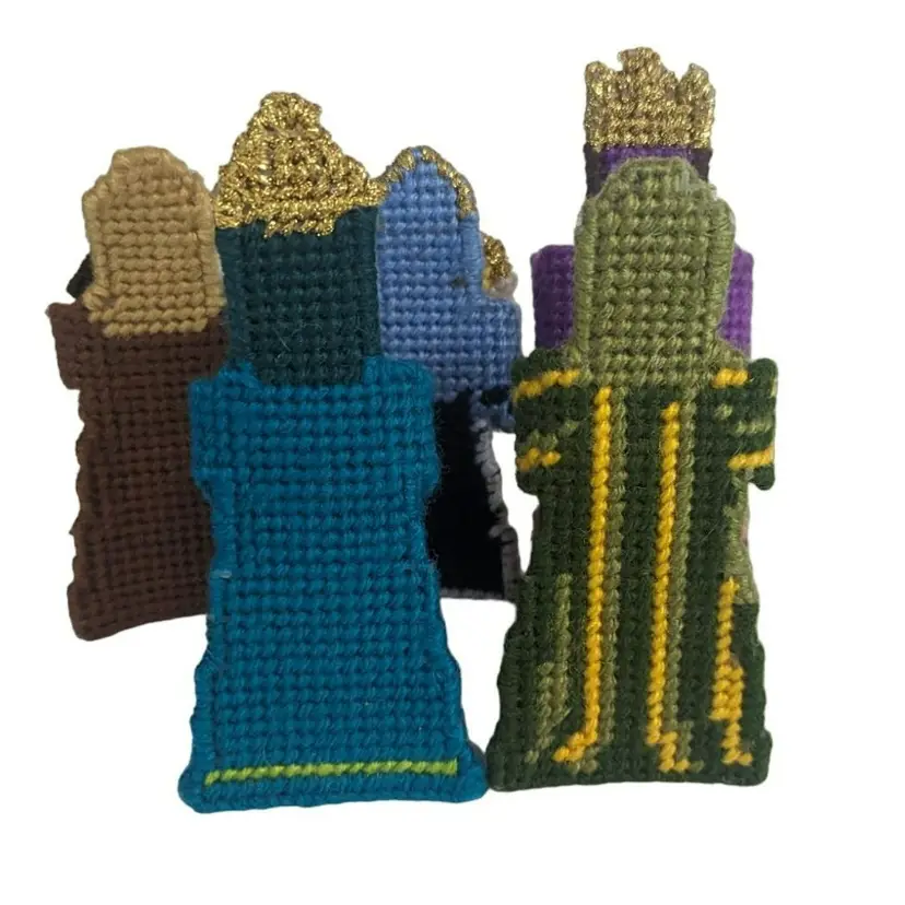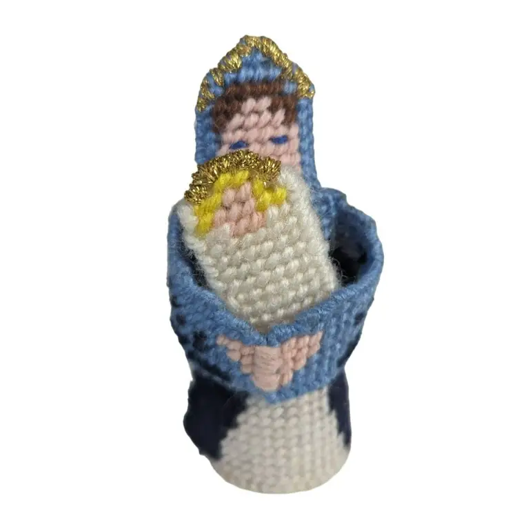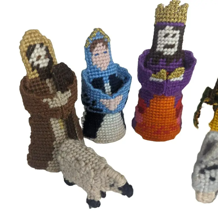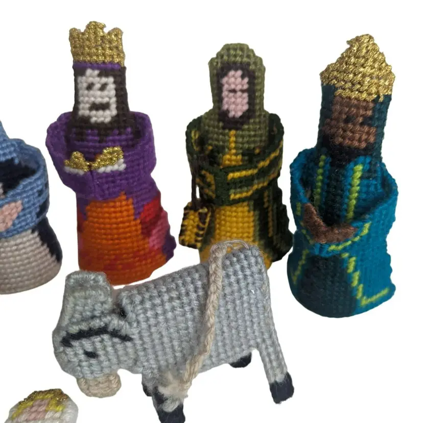 Vintage Plastic Canvas Needlepoint Nativity 8-Piece Set Handmade Christmas. Condition is preowned. Baby Jesus can be carried by Mary, Joseph, and the three Kings. They are roughly 6.5 inches high. These were from an estate sale and show signs of pet strands.