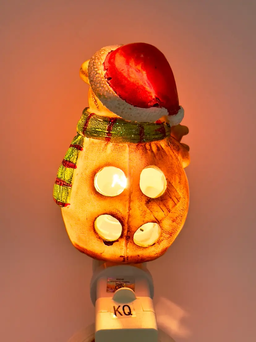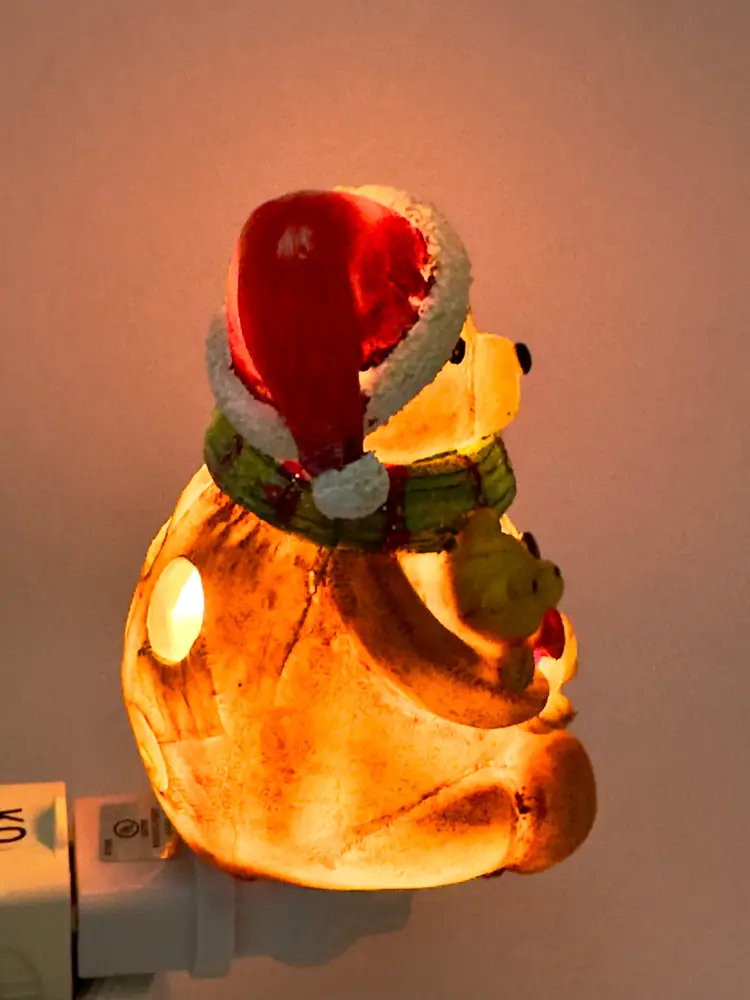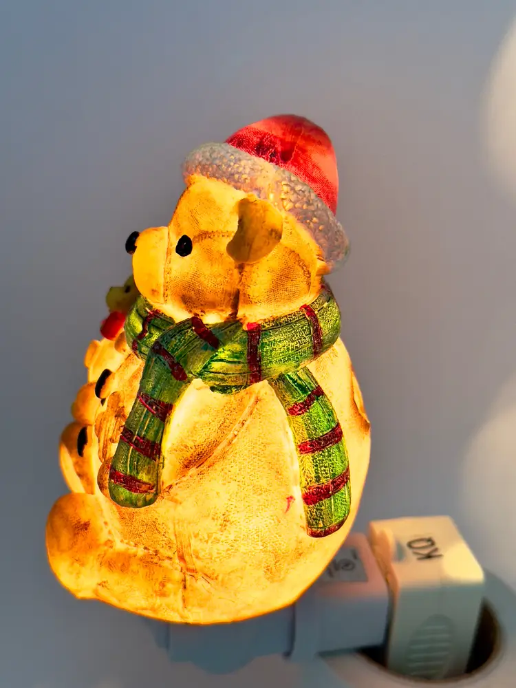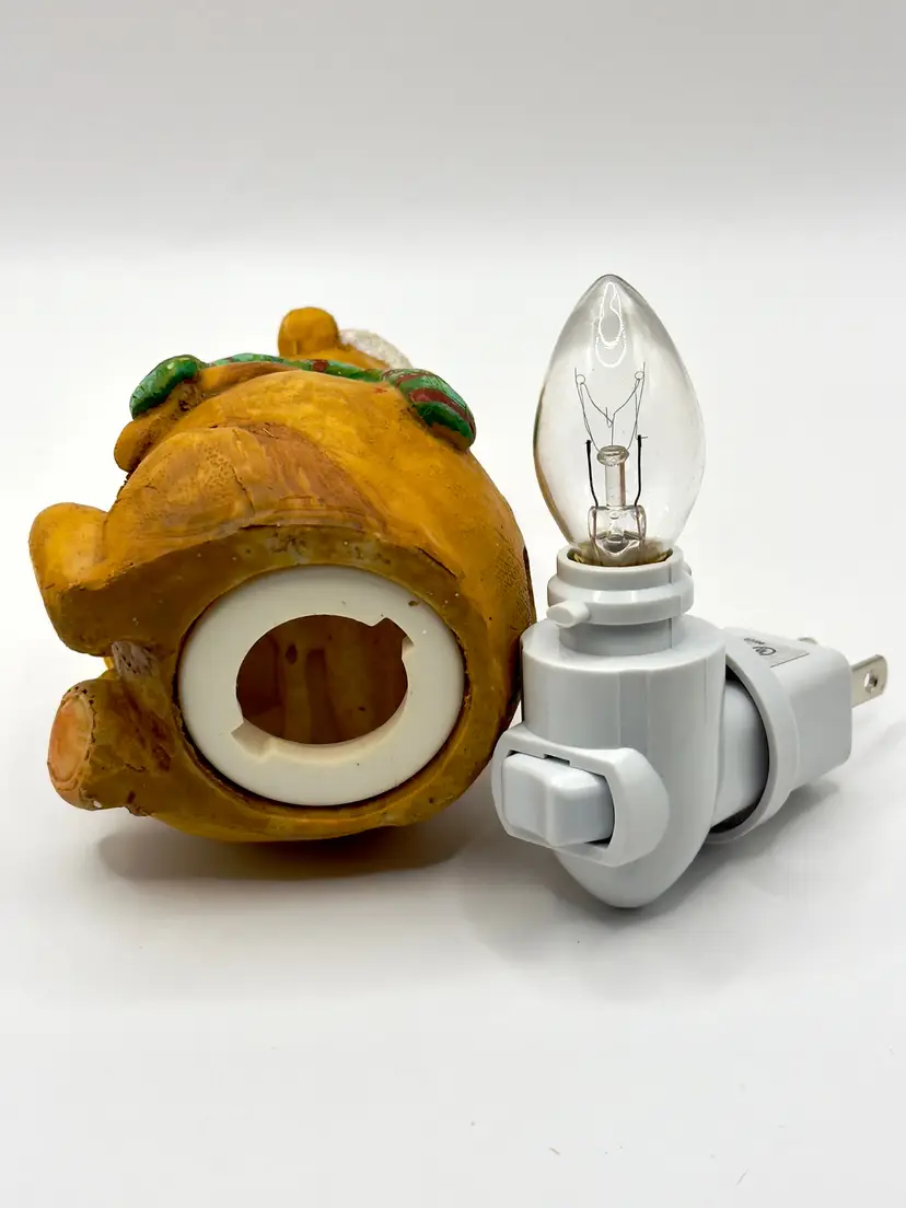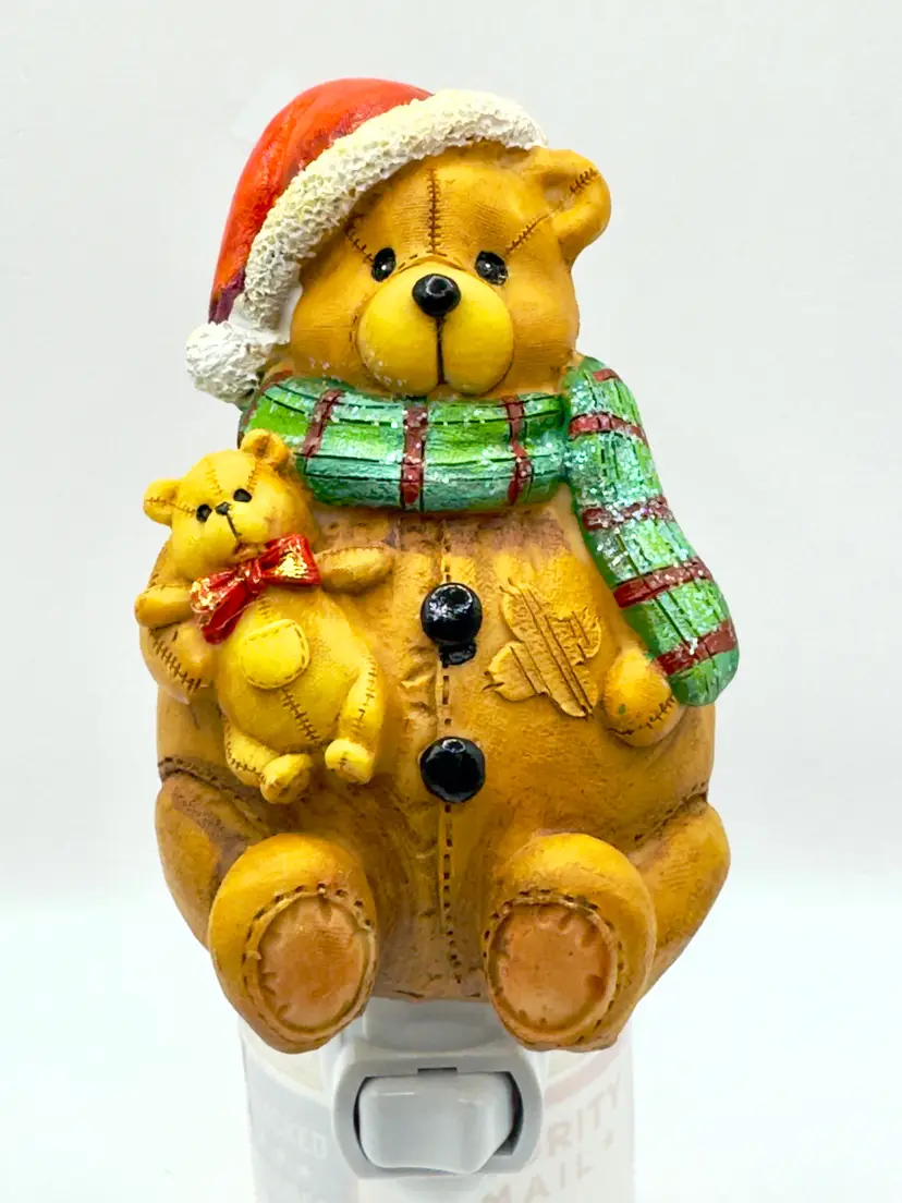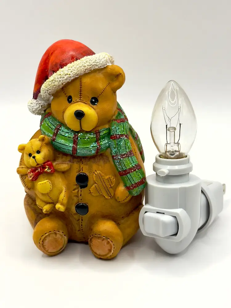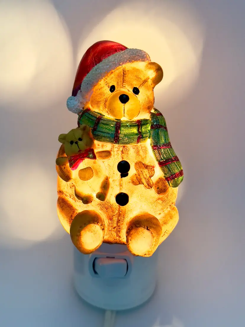 Brighten up your holiday season with this adorable vintage Christmas teddy bear night light. Featuring a cute teddy bear in a Santa hat and scarf, this night light adds a warm and festive glow to any room. Perfect for holiday decor or as a charming gift. Excellent condition with no chips or cracks. Brand new bulb. Measures 2.5x4.5x2.5 inches. Weighs 6oz.